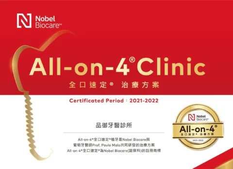 All-on-4 利用「斜張橋」般的特殊力學設計,前面兩顆垂直的植體,後面兩顆 30 度至 45 度的植體,支撐單顎一排 12 顆牙,一日內獲得牙齒、恢復笑容。且品御使用 數位臉掃技術 與 精準植牙系統 ,讓手術時間大幅縮短,更能快速裝上假牙。