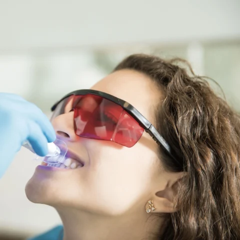 冷光美白是透過藍光照射塗上美白藥劑的牙齒,使黃垢產生氧化還原反應以達到美白的效果,可以在短時間內讓牙齒恢復亮白,所以很適合想要快速恢復齒色的人。適應於牙齒因食物飲料染色、牙齒天生泛黃者。療程前建議先經專業醫師診斷評估,再進行治療喔!