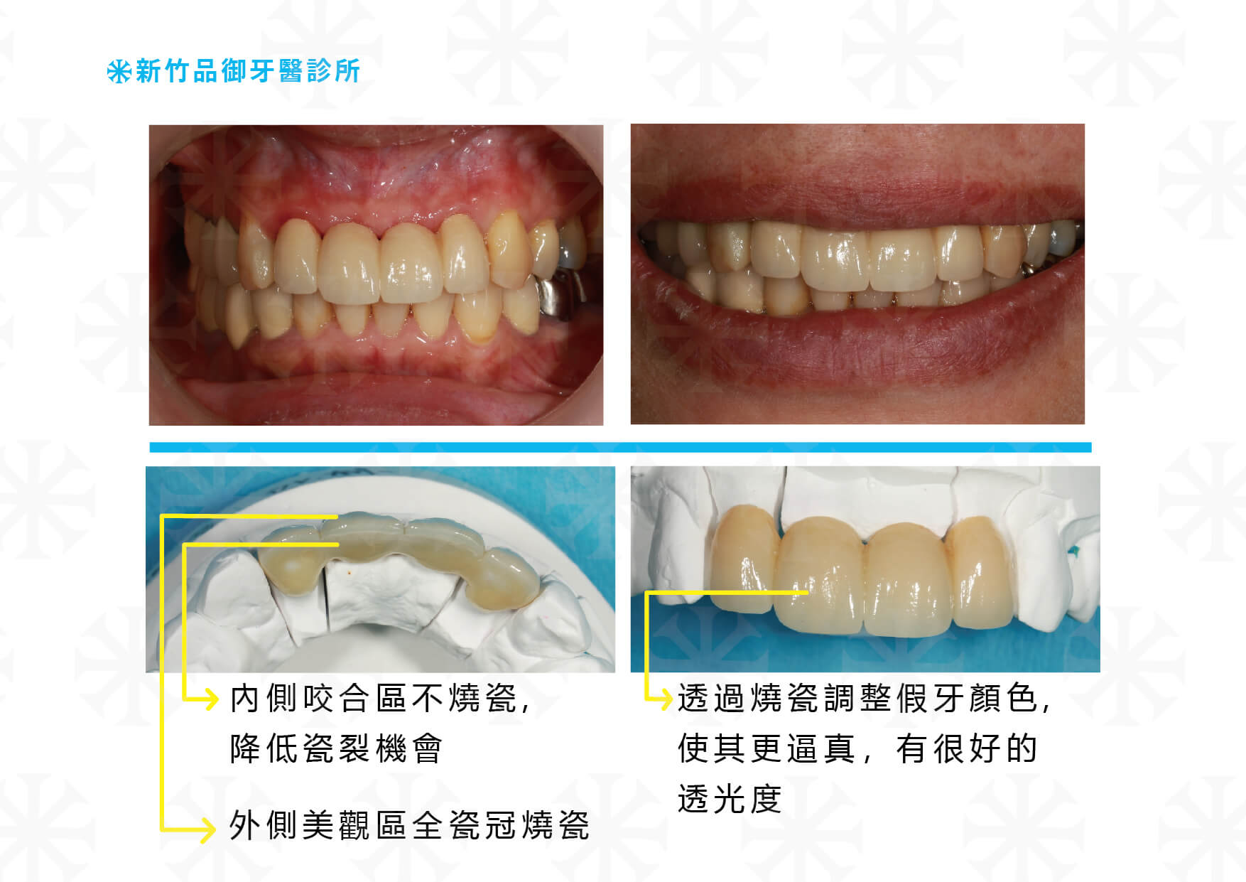 另外,為了在假牙外側燒瓷,會需要修磨較多的齒質,以保留厚度空間給陶瓷,相對來說就會犧牲比較多健康的齒質。