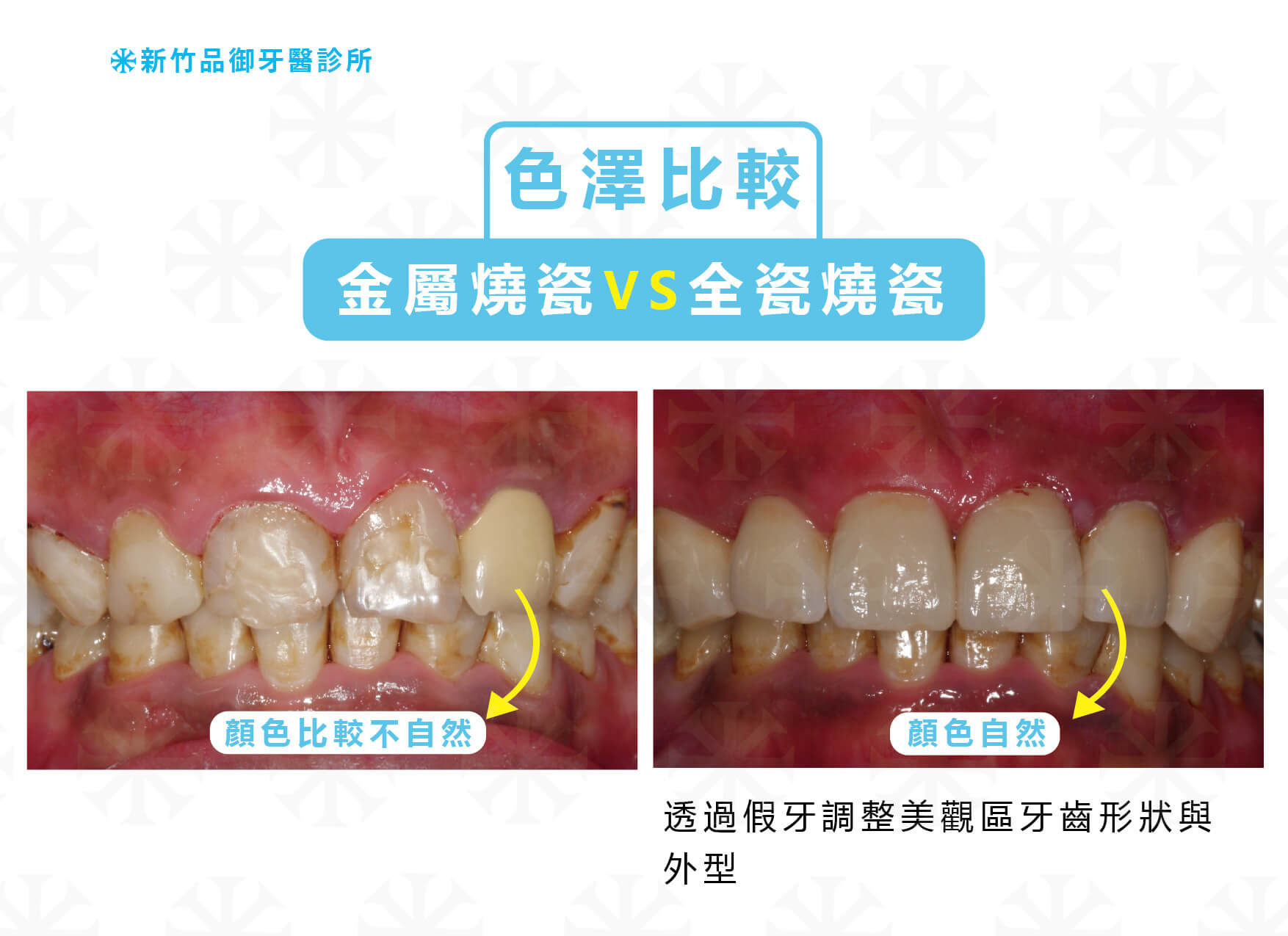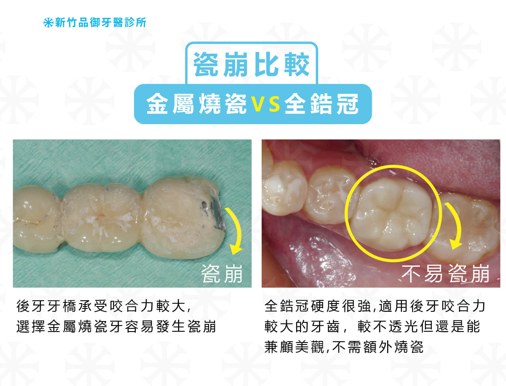 金屬假牙因為金屬色與真實的牙齒有很明顯的落差,所以通常會在假牙外側進行燒瓷,來模擬真牙的顏色,即金屬燒瓷牙。為了能夠遮住金屬的顏色,陶瓷的顏色會相對自然牙更死白,而略顯不自然。然而,後牙臼齒因為承受的咬力比較大,因此後牙燒瓷金屬冠常常會發生瓷崩的現象。另外,如果有睡覺磨牙或前牙深咬的情況,前牙金屬燒瓷冠也容易發生瓷崩。