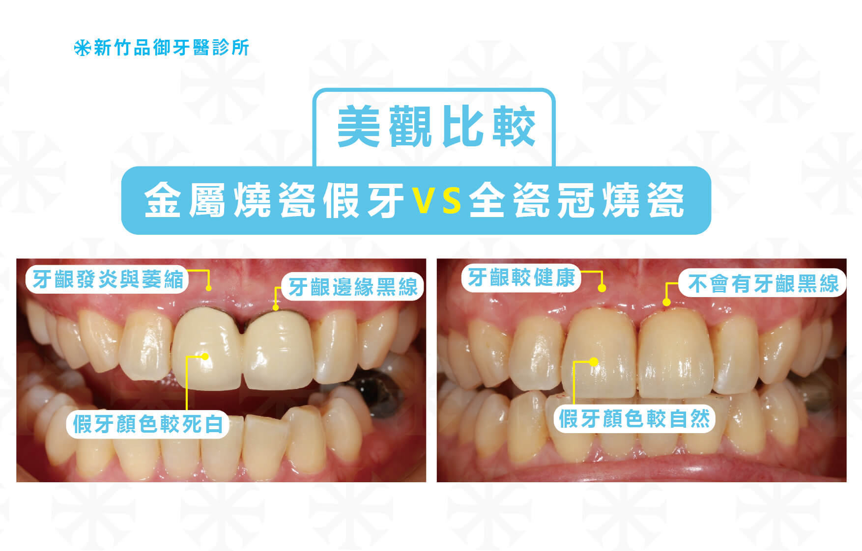 隨著牙科材料的進步與發展,全瓷冠漸漸取代金屬牙與金屬燒瓷牙。全瓷冠除了有很好的生物相容性外,不容易引起牙齦發炎與染色,也有很強的強度與穩定性,另外又能兼顧美觀,是一個很好的假牙材質選擇。