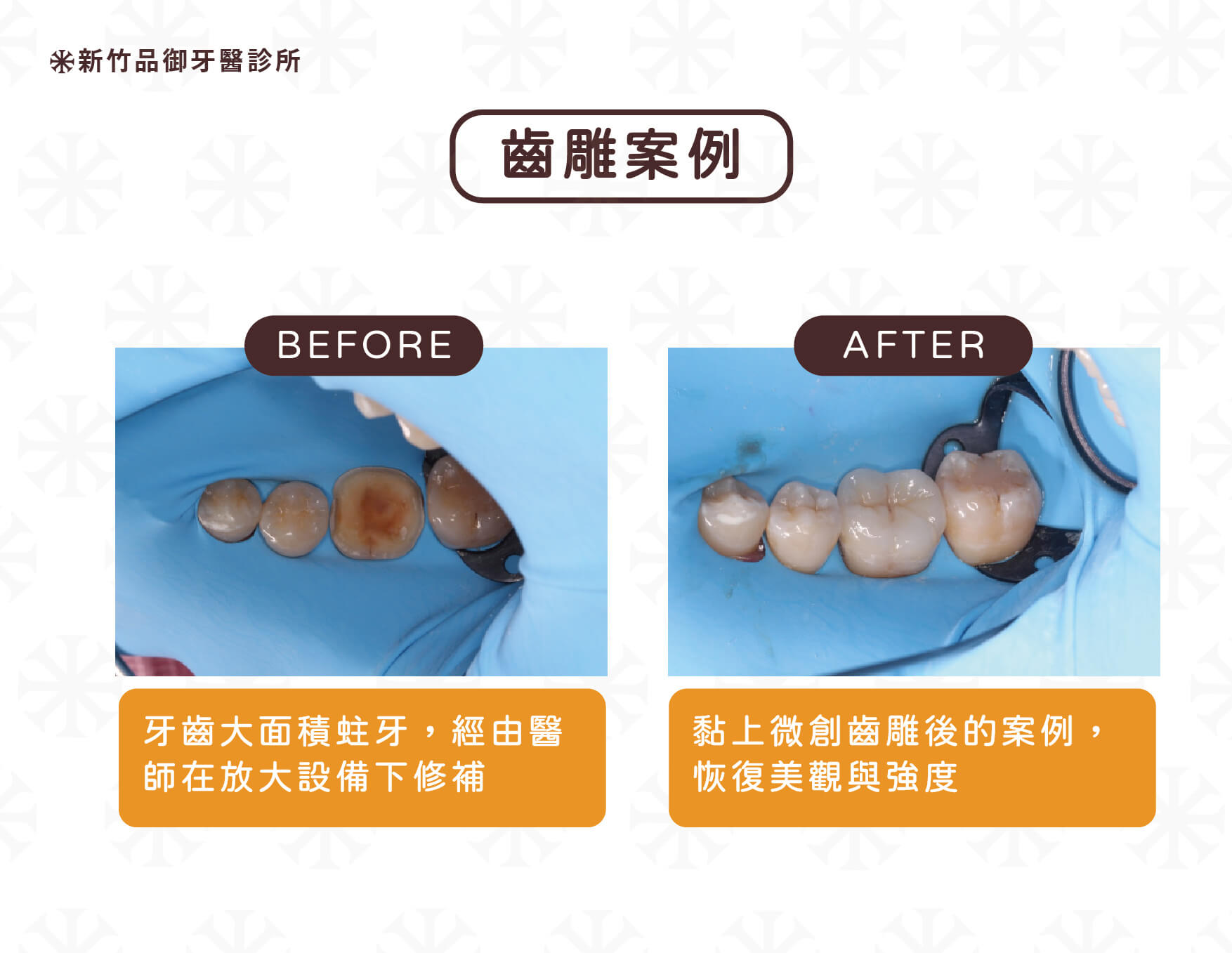 - 沒有缺牙,而是牙齒有根管治療,或是大範圍蛀牙等,可以以「牙冠」或「齒雕」保護牙齒。