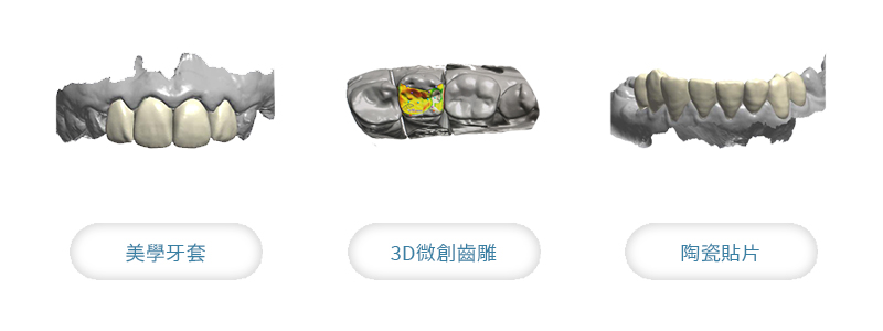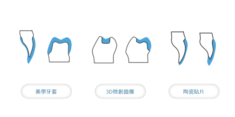- 3D 齒雕 : 依照齒質的缺損修磨約 0.8mm~2mm 的厚度,適用於缺損較大的牙齒。