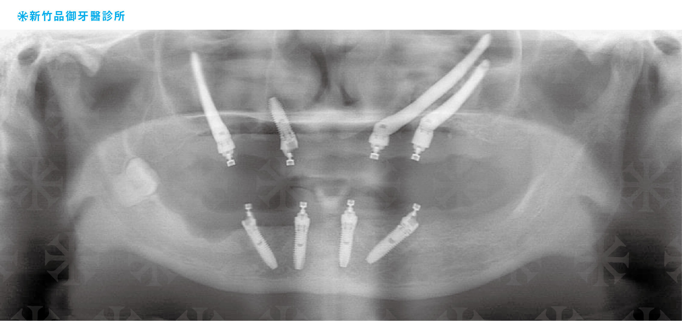 2. 手術後可見上下顎四隻植體安全地照計畫重建,當日即可裝上美觀性假牙