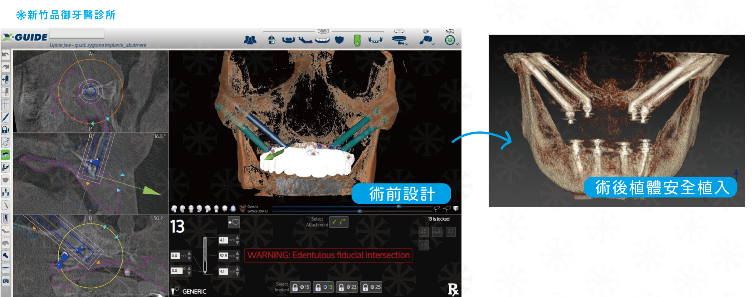 以上內容概括簡略說明一下,要達成安全又成功的全口植牙重建治療,必須關注手術中身體的健康,減少手術創傷,並使用優質的植體,將植體放置在最適當且安全的位置,才能順利完成全口植牙治療。