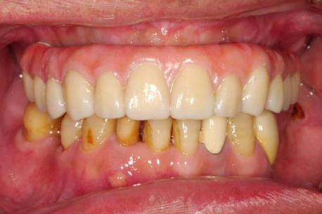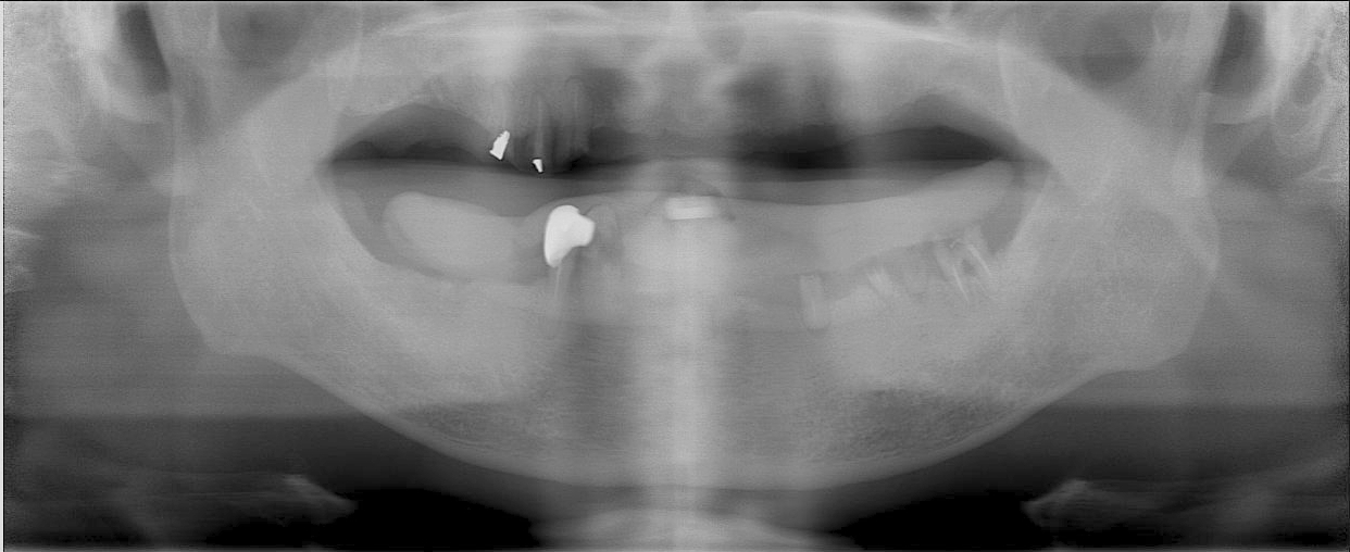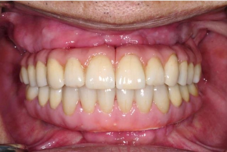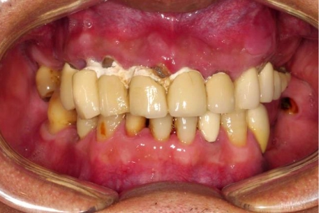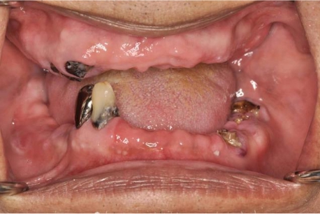 吳先生口內原有的舊假牙是一整排,但因為蛀牙已經蛀光,舊假牙搖晃隨時都可能會掉落,並且上顎剩餘的牙齒有嚴重的牙周問題,所以醫師評估後為吳先生制定了上顎 All-on-4 的全口植牙治療計劃。
