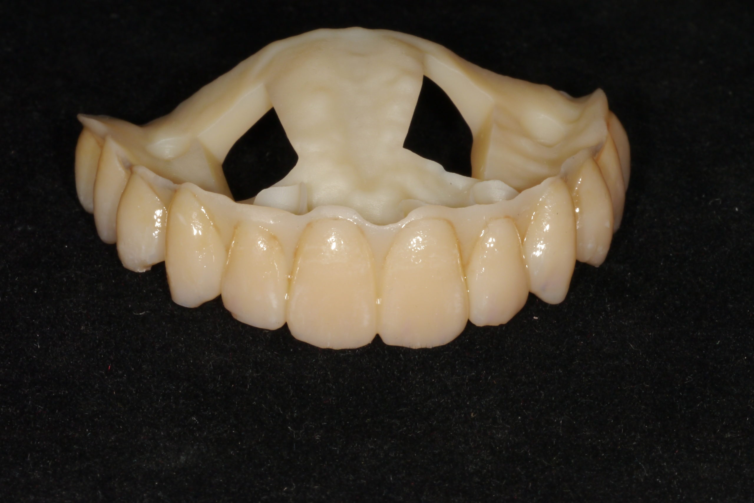 印完模後一個月,試戴蠟型假牙的型態及咬合位置,只能戴在嘴巴裡看看,但不能戴回家使用。給病人看正式假牙的外觀,確認無誤才會進行製作。
