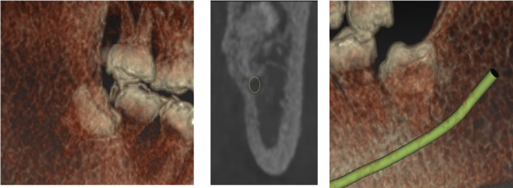 我們就舉個拔智齒的例子來說吧,應用牙科 3D 口腔電腦斷層( cone-beam CT ),可以清楚看到智齒和下齒槽神經之間的相對關係。在手術前就可以預知,術中堤防可能造成的併發症,降低同側嘴唇神經麻木的風險。