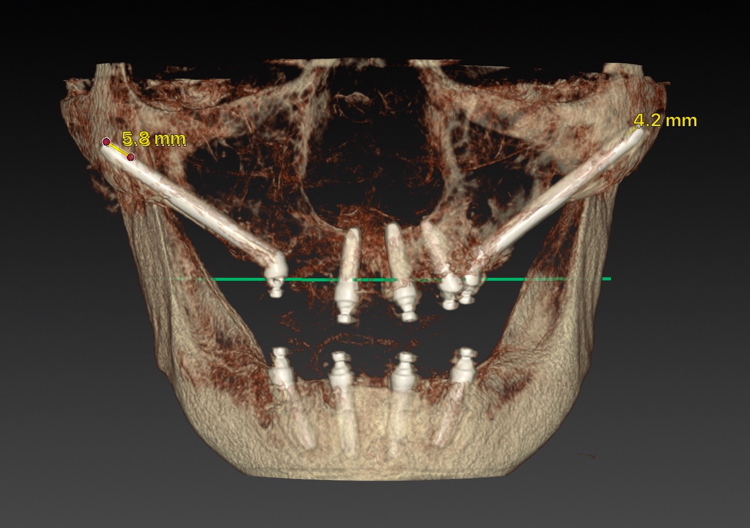 在全口重建領域,擁有好的電腦斷層( cone beam CT )更是重要,可以提供更清楚精準的解剖構造。好的設備就可以更安全施行手術。數位的時代,甚至未來 AI 醫療的時代,帶給我們更為安全,更舒適的精準醫療。以下圖為例,有個高解析度牙科電腦斷層,我們可以安全施行顴骨植體( zygoma implant )及 All-on-4 這些一日重建的技術。