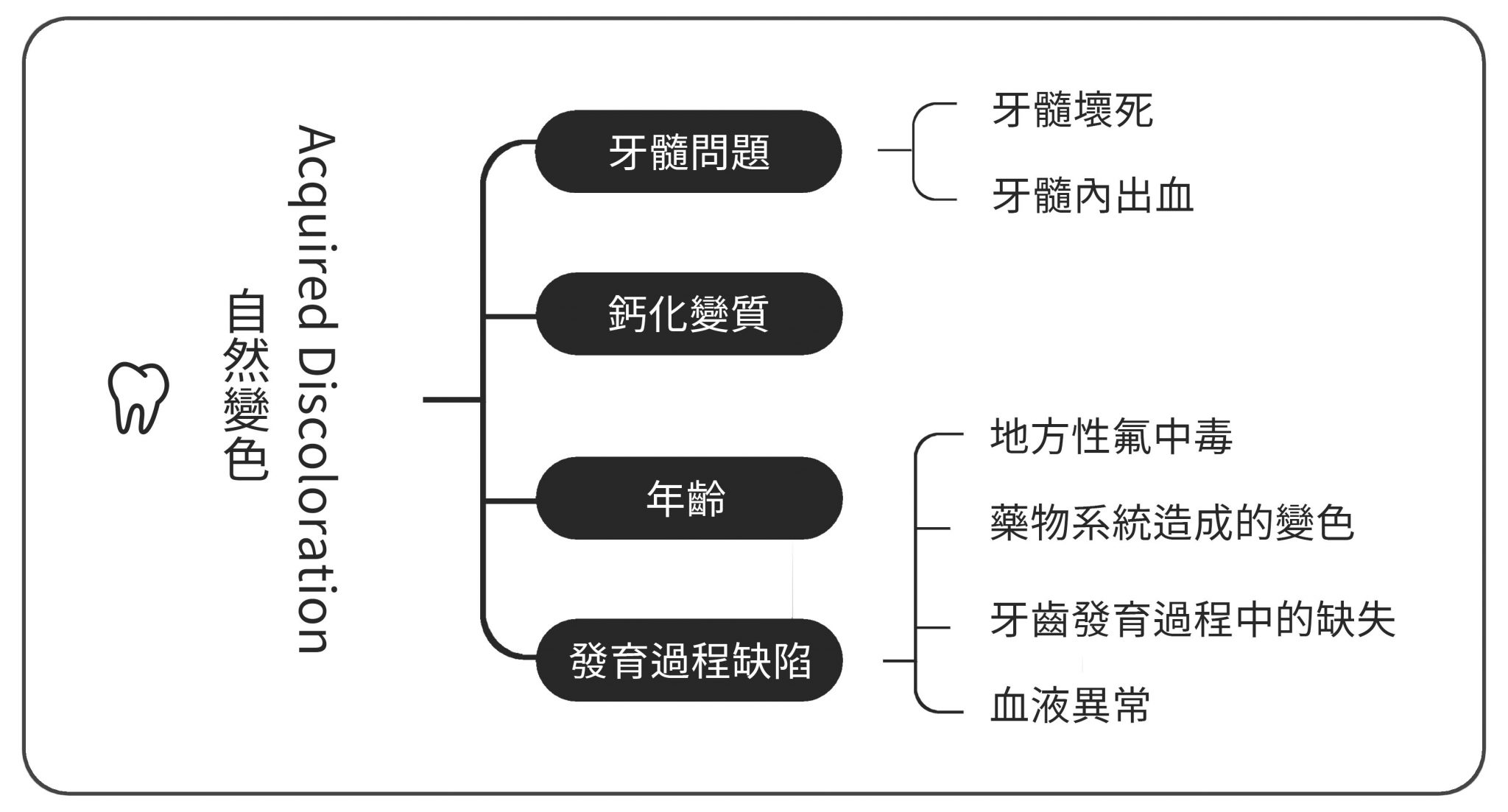 - 血液異常 Blood Dyscrasias and Other Factors : 因為身體系統疾病而造成紅血球溶解,如胎兒骨髓成红细胞增多症(erythroblastosis fetalis )這種情況就無法美白了。還有年代學發育不全 chronologic hypoplasia ,因為高燒而造成牙齒發育不全等,其他血液系統上的疾病都會影響牙齒發育不全而變色,這些也都幾乎無法做美白的治療喔。