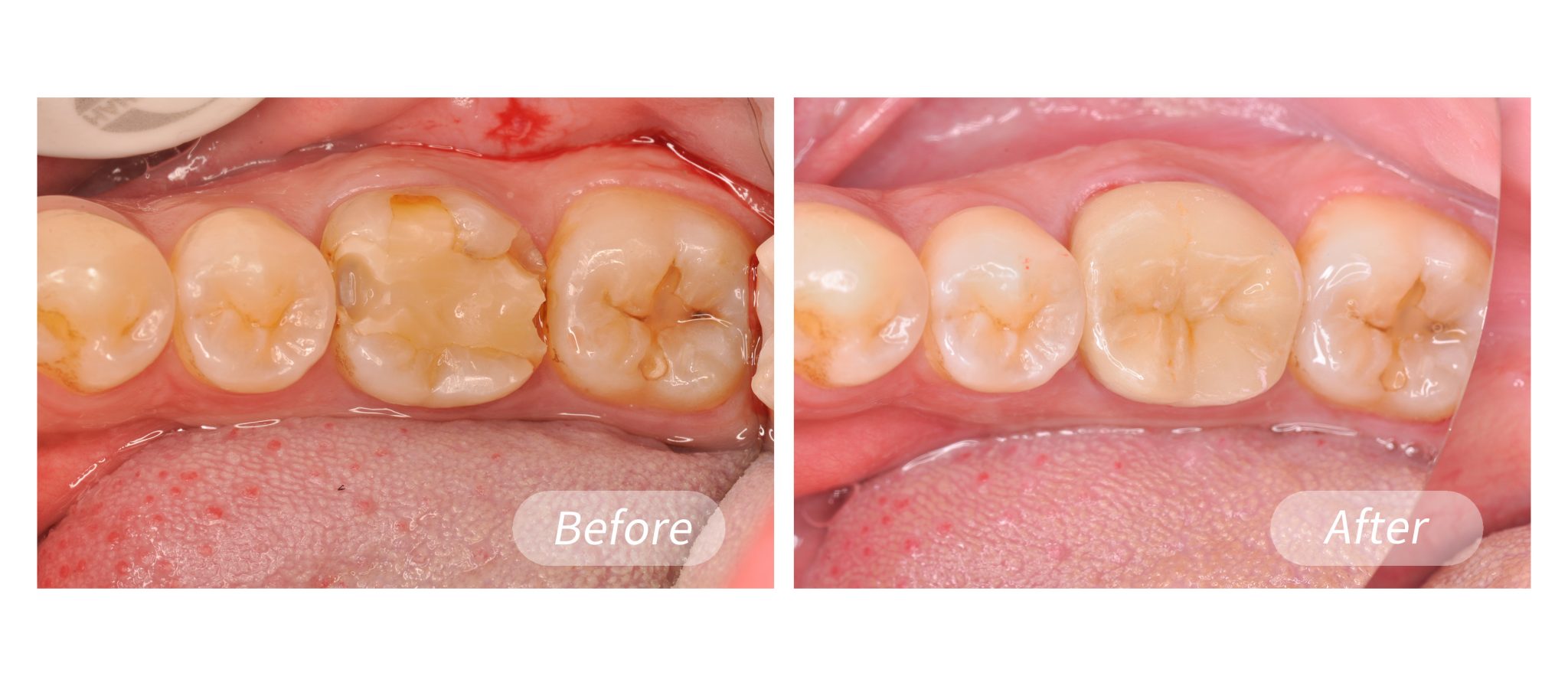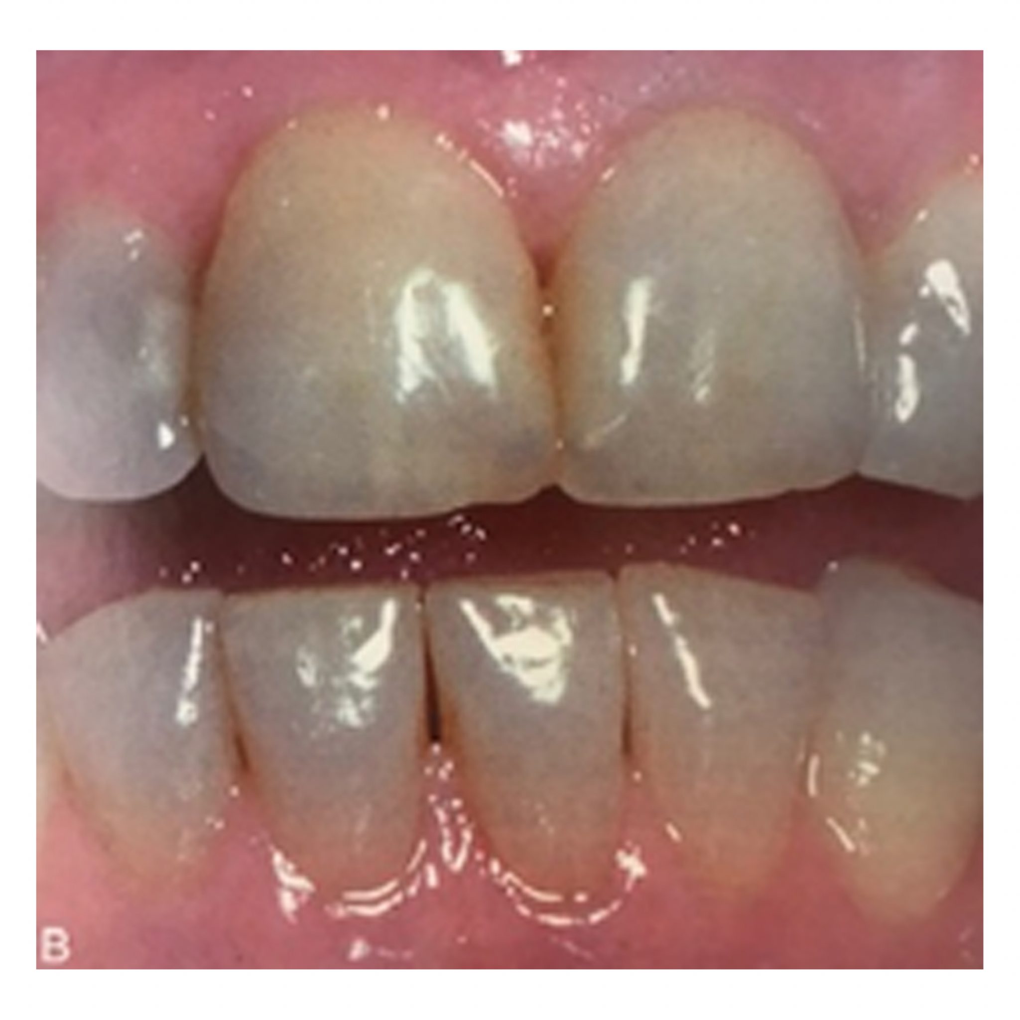 這情況也是因為外力所產生的,但神經沒有壞死,而是產生第三牙本質,而這些鈣化的牙本質顏色就會比較偏黃及暗沈,基本上用市售貼片也是無效的。