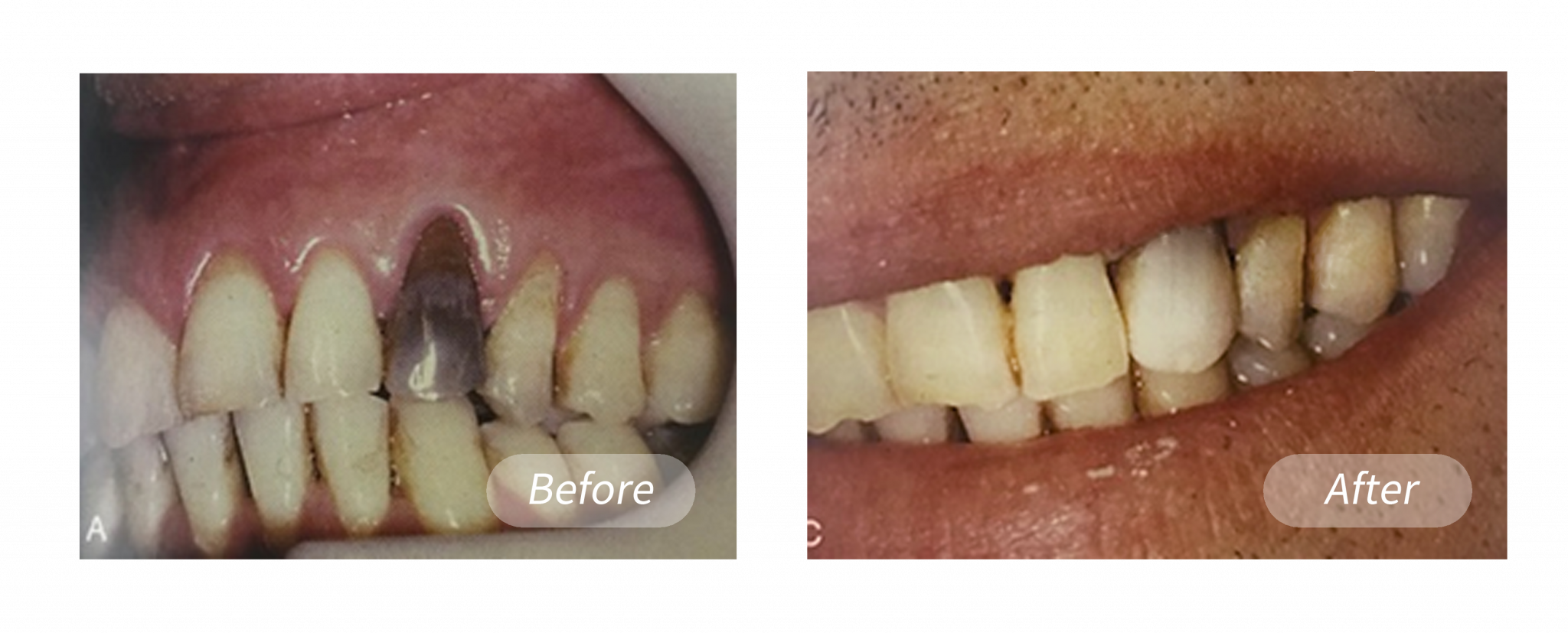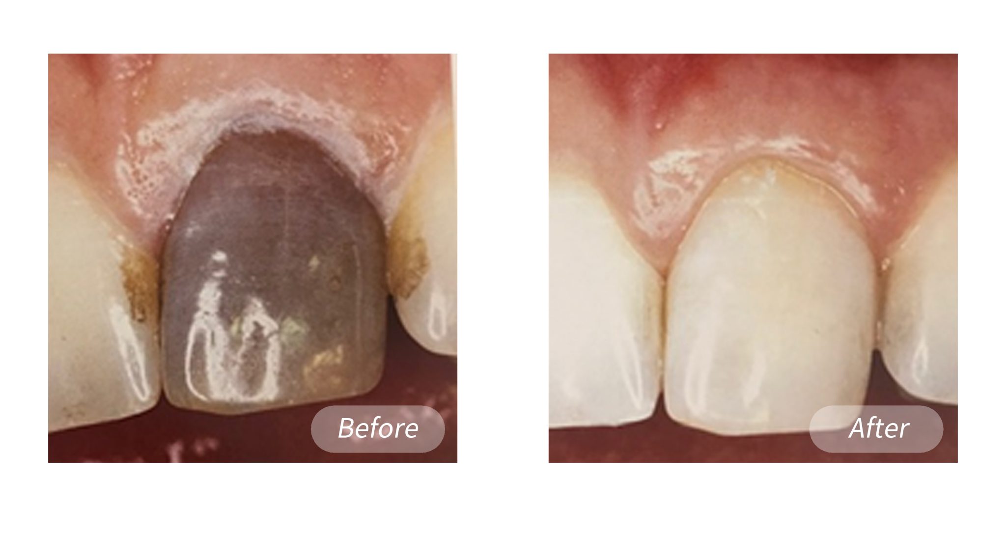 這種情況是因為外傷撞擊而造成齒內出血,所以要先抽神經及齒內美白才有效喔!