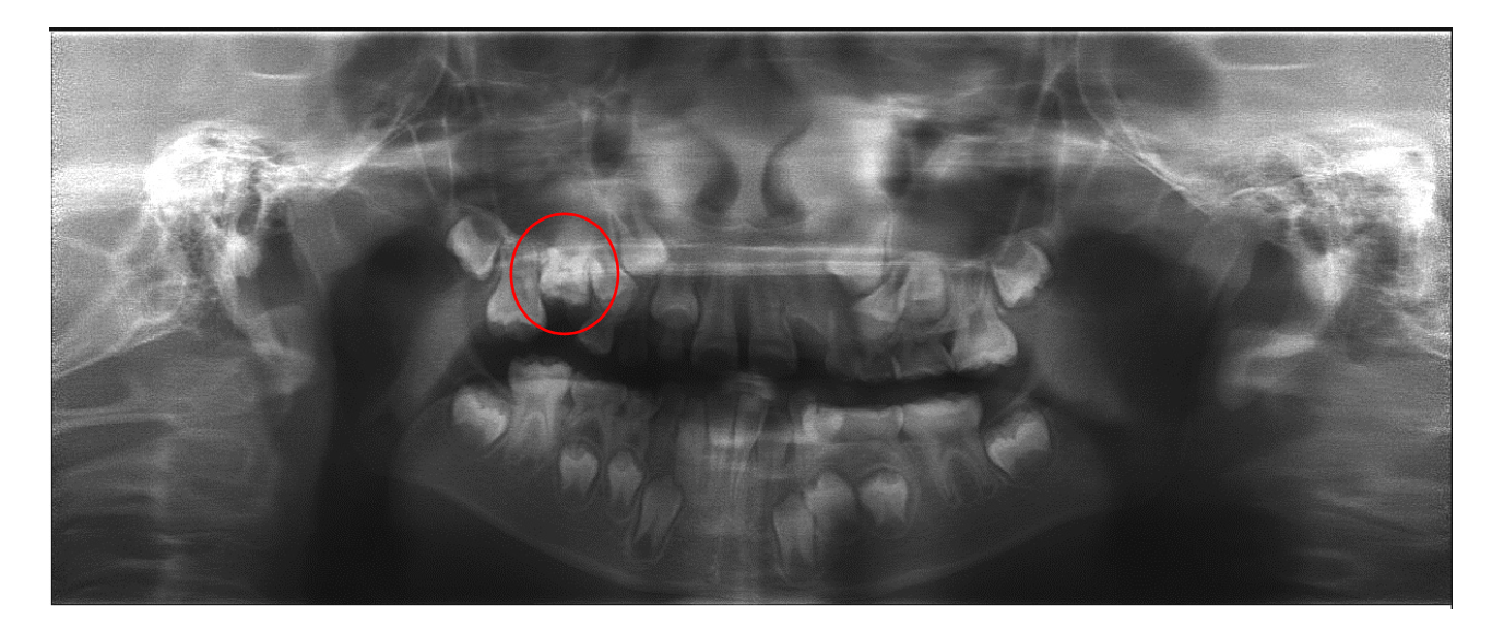 8 歲的周周抱怨右上會痛,原來是右上有乳牙不但蛀牙了,還躲在洞口長不出來,由於骨沾黏,造成牙與齒槽骨如膠似漆地沾黏在一起啦!還好有盡早發現、盡早拔掉,才終止了牙疼的噩夢,也才不更進一步地引起牙周病和齒列不整。