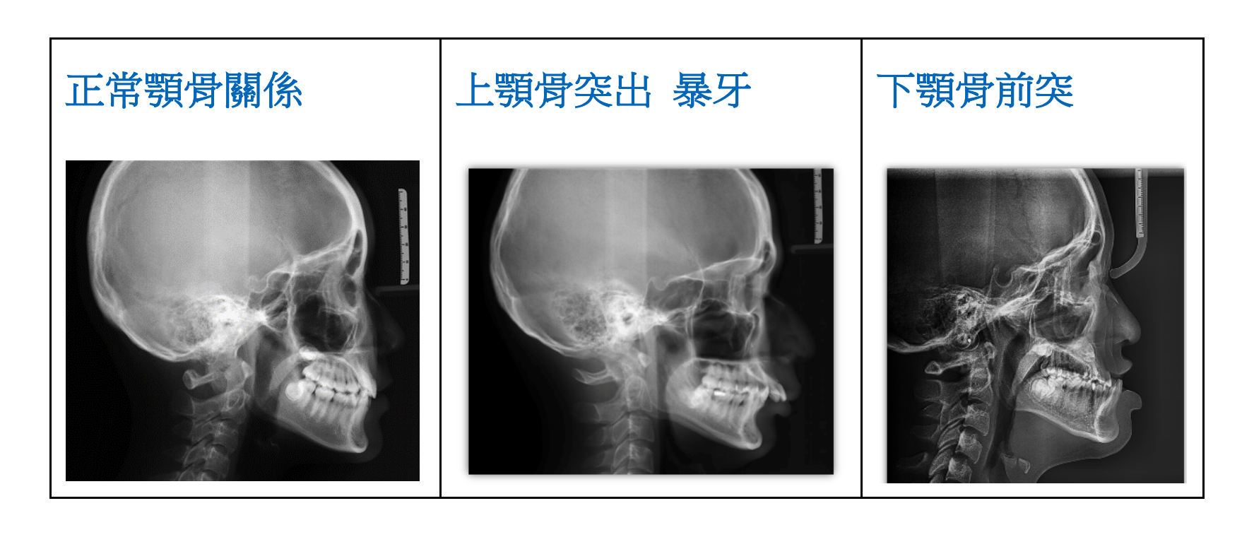 拍側面的 X 光片,可得知上下顎骨間前後的差距、上下門牙的角度,來判斷咬合不正是否是骨骼造成,或者純粹牙齒的角度問題。小朋友與青少年,還可以看頸椎來推斷生長發育在哪個階段,判斷何時介入牙齒矯正治療效果最好。