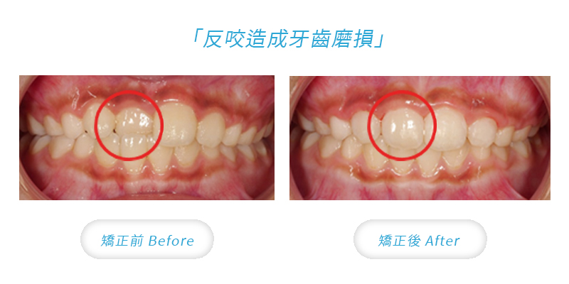 正常上下門牙咬起來時,上門牙會咬在下門牙的外側,反咬就是上門牙咬在內側,這種情形常會造成牙齒不當的磨耗、齒質受損變薄,有時還會造成對咬牙異常搖晃、牙肉萎縮等牙周傷害。