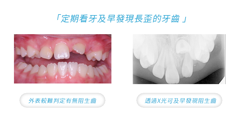 兒童換牙期間,恆牙長在不正常的位置(異位生長),甚至長不出來(阻生),就要藉用矯正的力量,甚至搭配手術(使牙齒暴露出來),將埋伏齒拉回來。因此,至少每半年定期給牙醫師檢查很必要的!有時需要拍X光,才能及早發現。