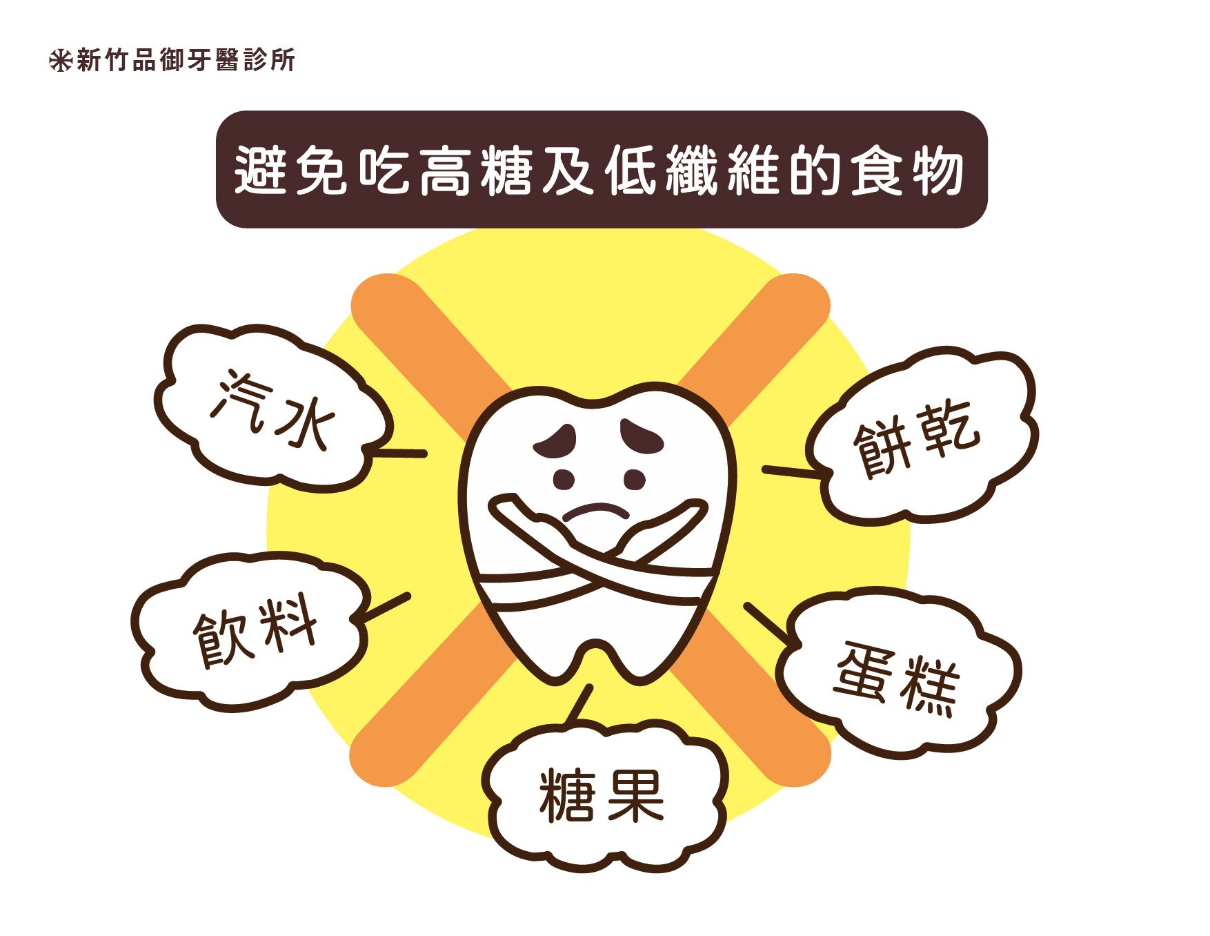 少吃高糖分、低纖維的食物與飲料,如:餅乾、糖果、蛋糕、汽水。