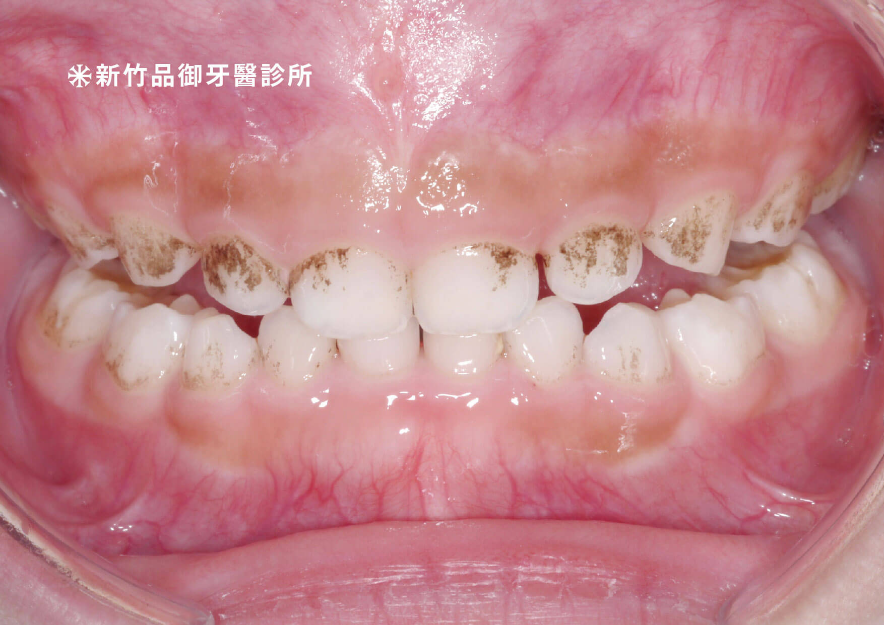 最早 2~3 歲,在乳牙齒列就可能形成,好發在牙齒內外側靠近牙肉的地方,形成點狀或線狀分布,有時延伸的範圍更大至咬合面,甚至牙齒內外側的整片牙面。