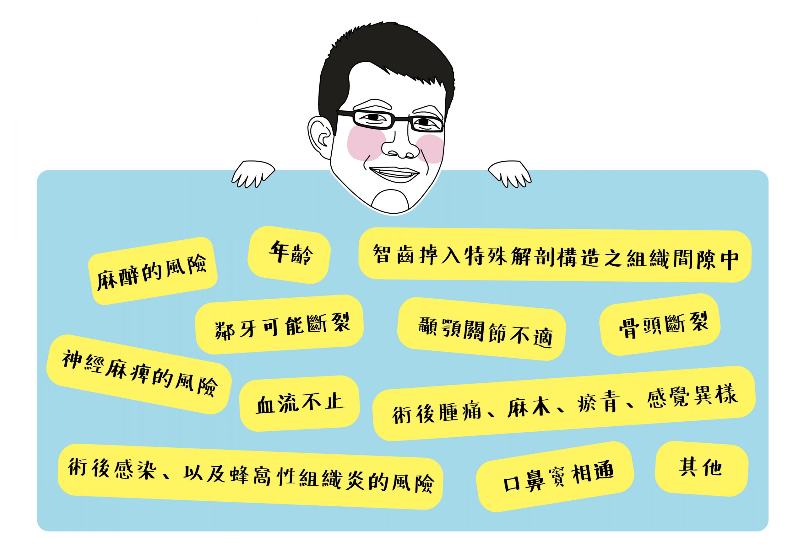 但病人看到這麼多風險,往往也會望之怯步,反而延誤了拔智齒的黃金時間,得不償失。