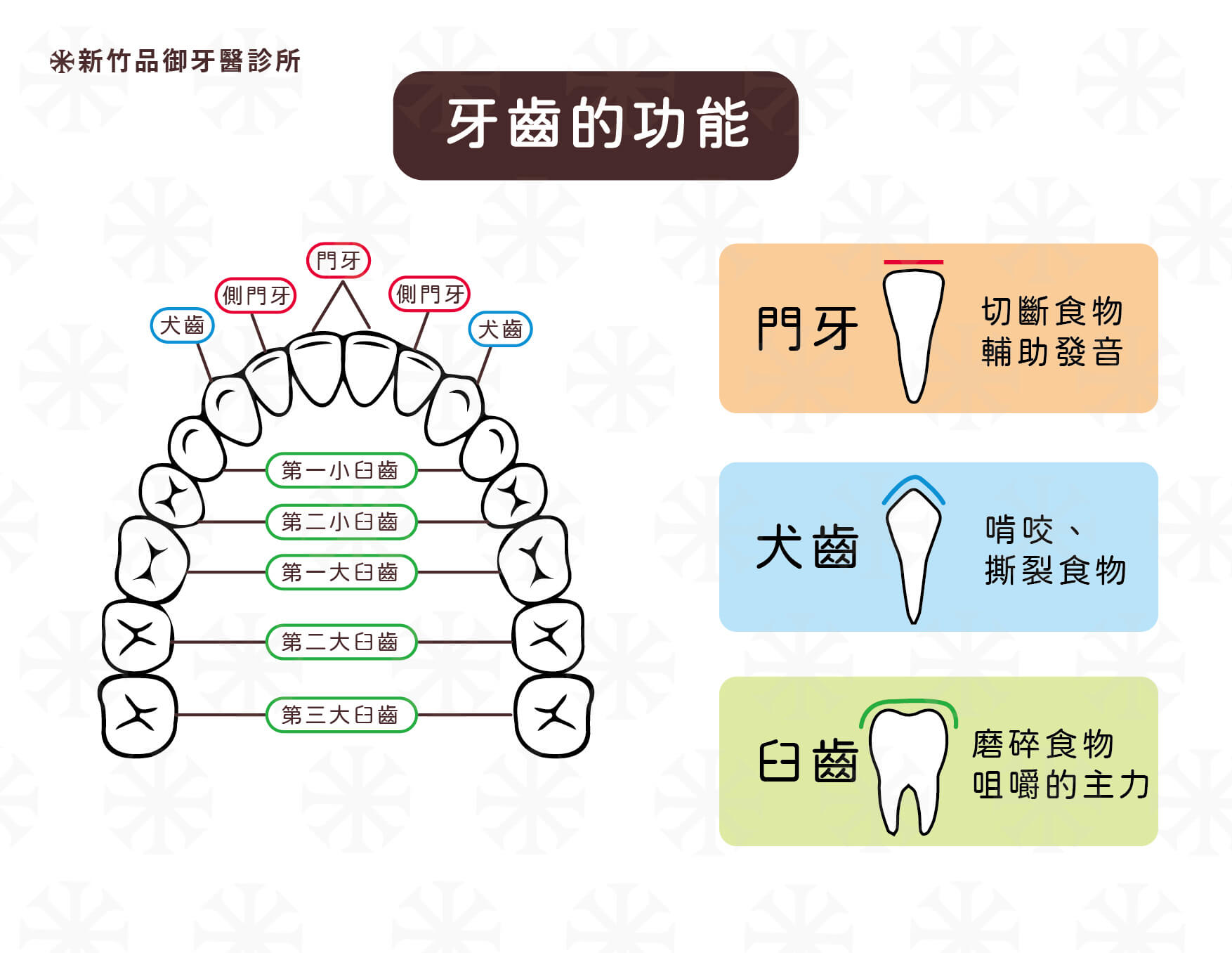 - 前牙區的門牙除了美觀之外,還有咬斷食物、輔助發音的作用。