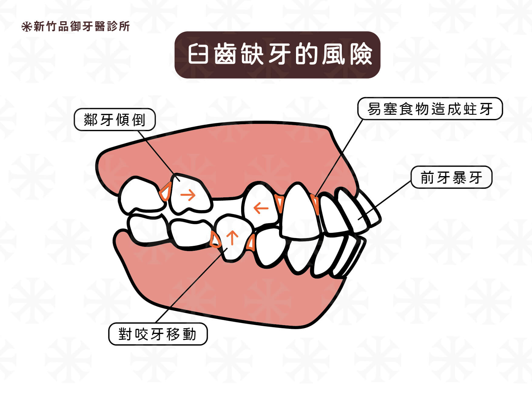 相鄰的牙齒因為沒有支撐力就會往前傾倒。傾倒的牙齒有死角不易清潔,在清不乾淨的情況下,蛀牙、牙周病就會隨之而來。