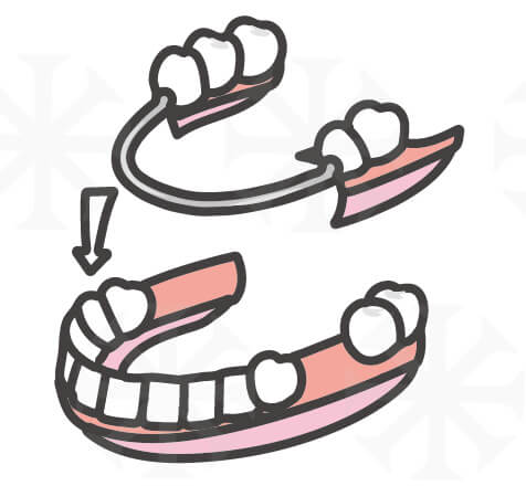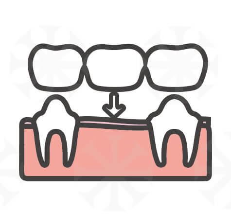 利用缺牙位置的前後牙當橋墩,修磨後將三顆假牙相連在一起。但也因為相連在一起,無法使用牙線清潔,需要用特殊工具清潔牙橋,否則兩旁的支柱牙容易有蛀牙或牙周病的問題,且兩側牙齒需要幫忙分擔中間牙齒的力量,會承受較大的咬合力。另外因為前後相鄰牙需要大量修磨,修磨過程中有可能會影響到神經而神經壞死,需要做根管治療。