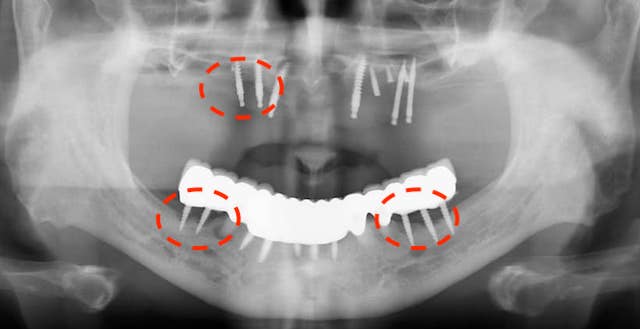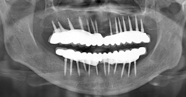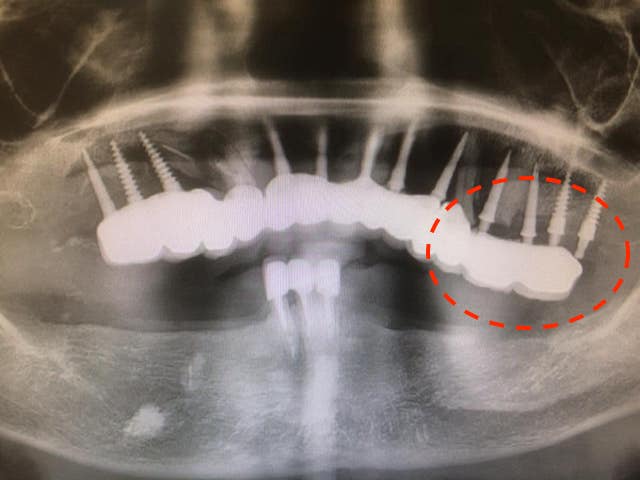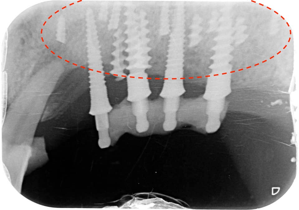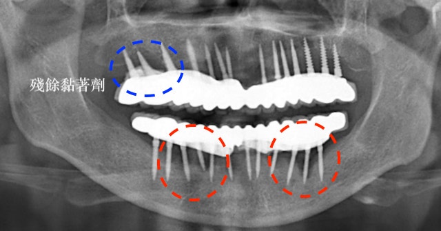 因為清潔不易(植體太多、太密合、又有黏著劑的問題),所以我們看到的案例幾乎毫無意外的全部都有植體牙周炎。