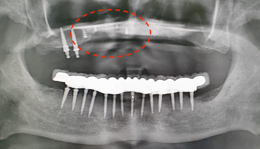 迷你植體斷裂後,斷片無法移除,然後就變成了像下圖一樣的「滿天星」,全部遺留在齒槽骨內。