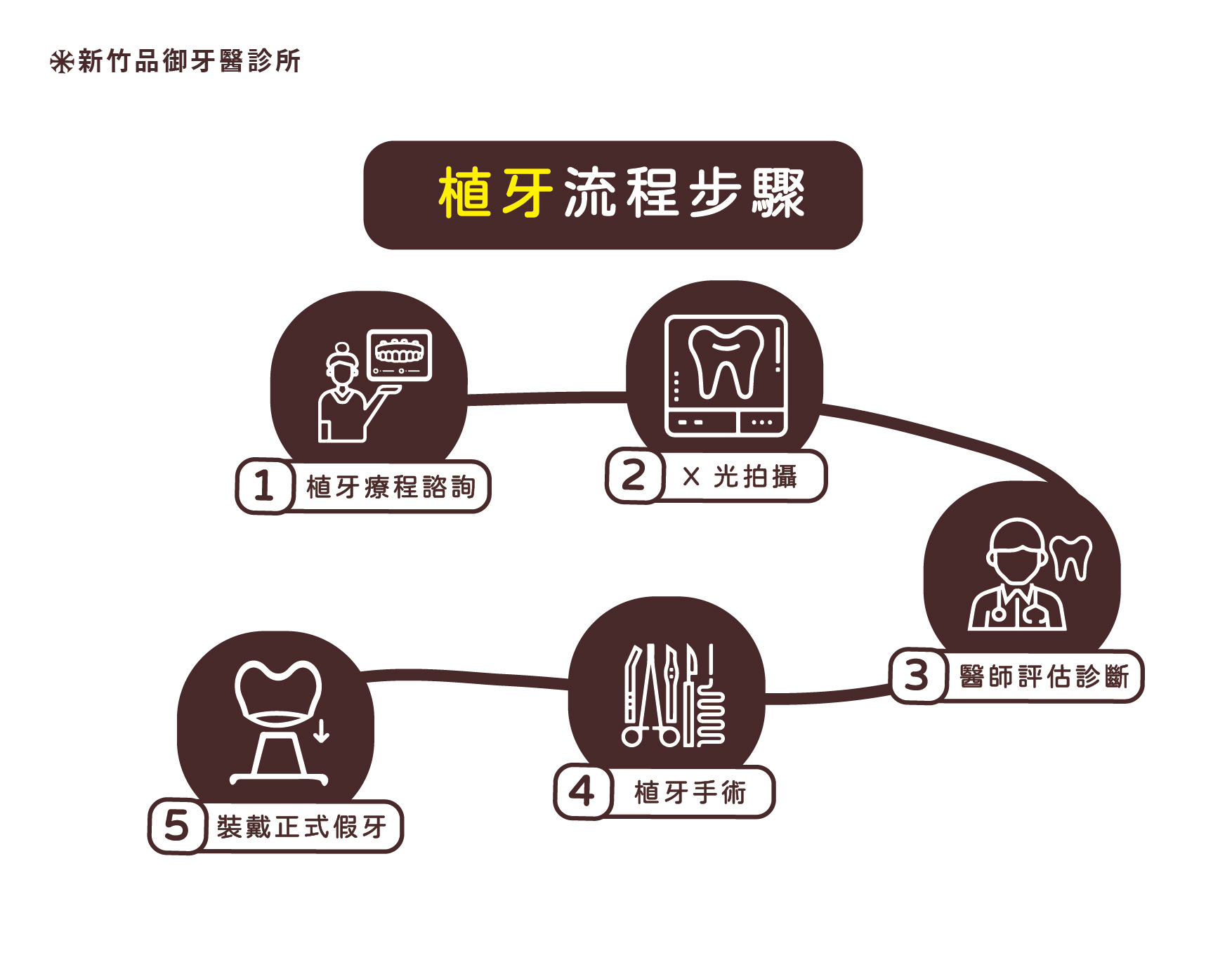植牙過程可區分為兩階段。第一階段包含翻瓣手術、植體位置孔洞擴大、植體植入,且手術會因個人植牙條件伴隨著補骨等相關手術,其中包含常見的牙肉增厚(補肉)或(補皮)上皮移植術;第二階段則有植體露出手術。而植牙手術中進階手術包括:全口重建手術、鼻竇增高術、顴骨植體手術…等術式,其中又以顴骨植體為難度較高的手術。