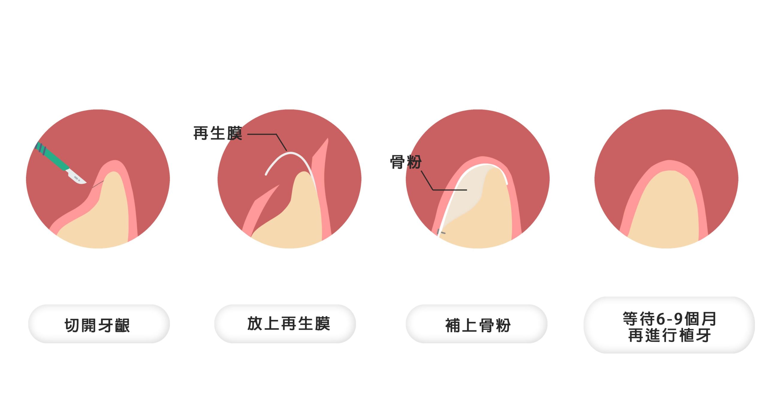 依照骨頭缺損型態有不同養成骨頭的時間。水平導引骨再生術約需要 4~6 個月。垂直補骨需要 9~12 個月才能重建回來。這段時間需要避免壓迫到傷口,導致骨粉塌陷。當骨頭補回來後,還需要等待植體與骨頭接觸變硬成熟,需要 3~6 個月時間,也常需要補皮加強外殼保護。 地基建立好需要較長的時間等待,需要耐心配合醫師診療。