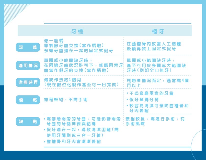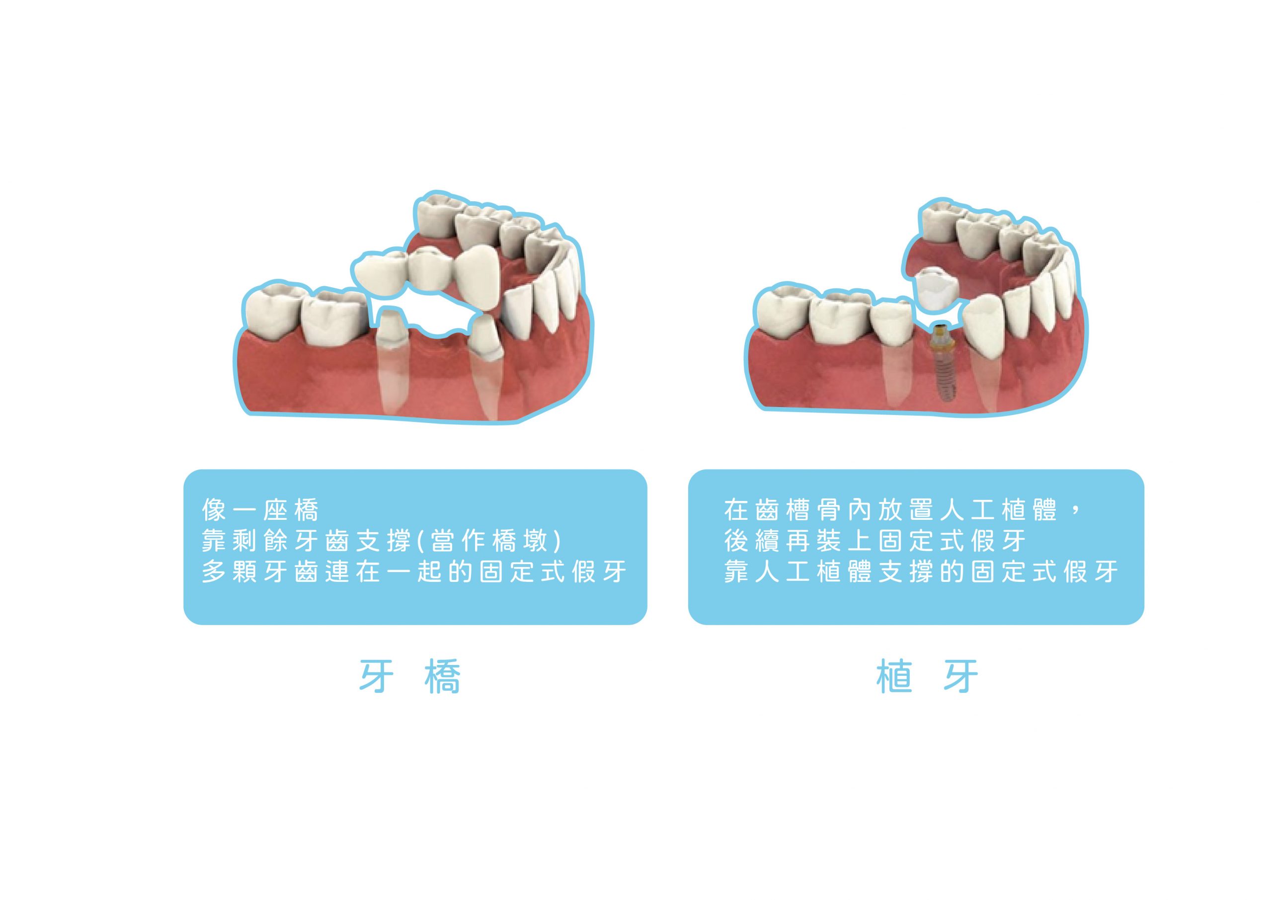 若是單顆或小範圍缺牙,一般情況會建議做固定式假牙重建,至於固定式假牙中又分為牙橋以及植牙,兩者各有其優缺點,以下用表格的方式來比較與說明兩者的差別。