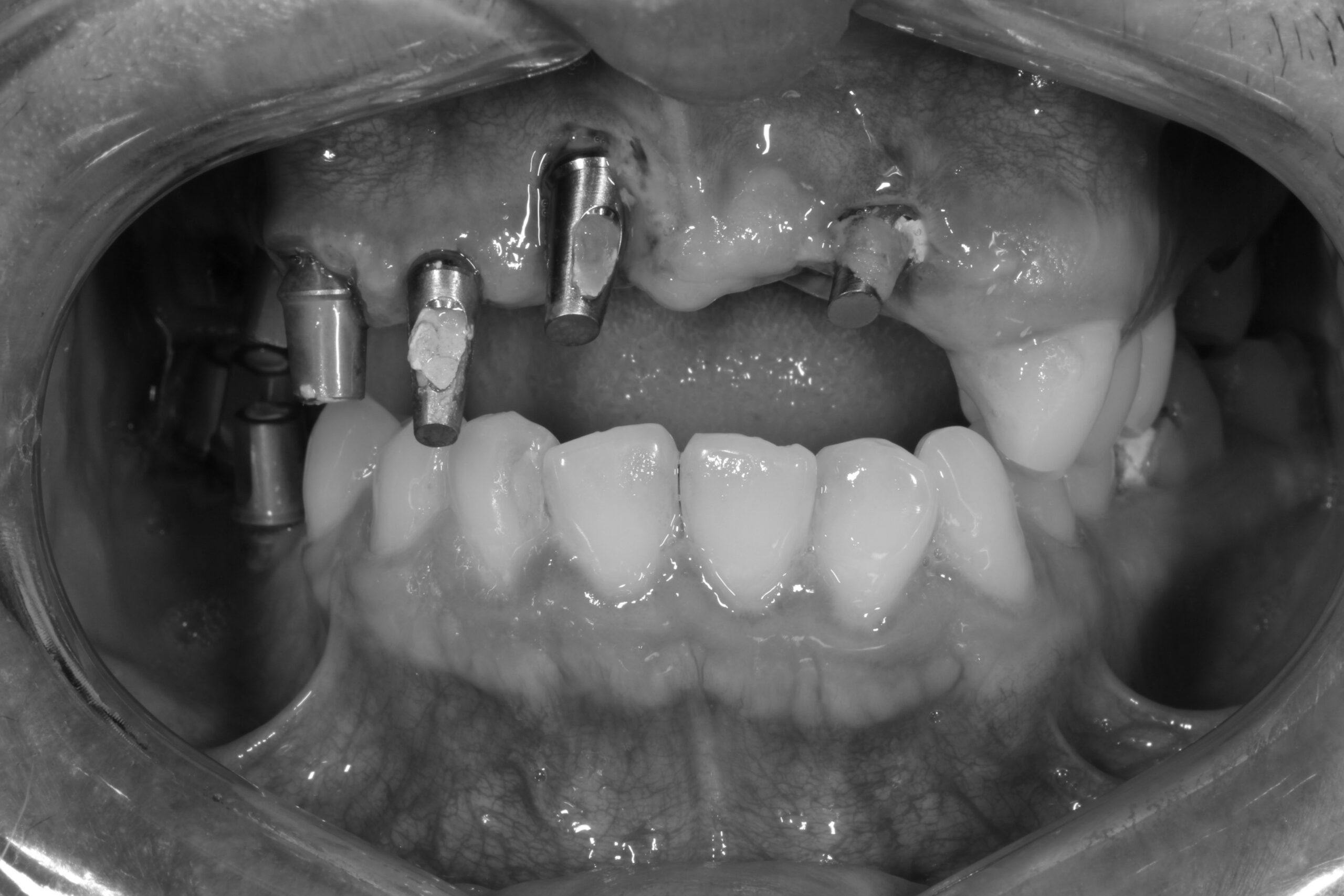 如上面這張圖,則是沒有使用數位導引板的植牙失敗案例,可以發現每一顆植牙都不是在正確的位置上,歪歪斜斜的,根本無法用來製作假牙。像這樣大範圍的全口植牙,如果沒有導引式植牙,將會事倍功半,甚至造成沒有辦法彌補的過錯,沒有任何人希望這樣的事情發生在自己的口內。