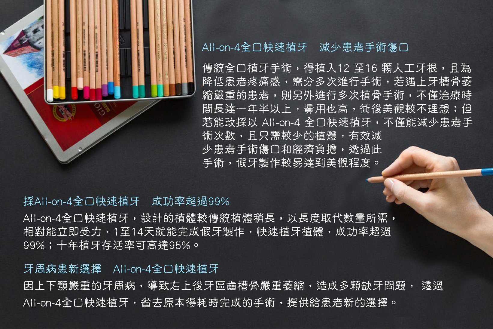 鍾泰豐醫師引用了一句李國修大師的話,說明了他對於All-on-4的熱情與責任,鍾泰豐醫師明白只有專注在一件事情上,才能把它做好,也因此從2012年便開始全心投注在全口無牙、全口少牙的重建上,尋找台灣在地適合的材料、相關的供應商,一步一步的改良、調整,一直到今天,甚至能夠提供專業的課程給其他牙醫師。
