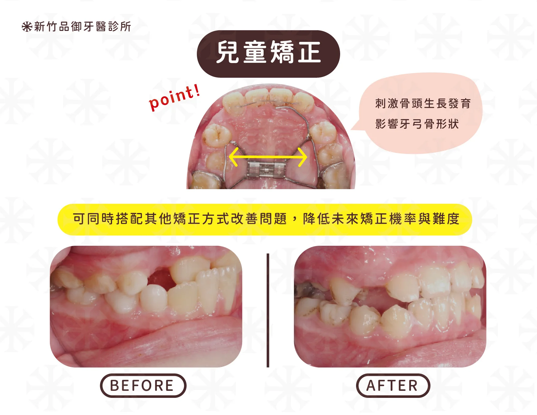 但矯正重點會偏向是刺激骨頭的生長發育,去影響牙弓骨的形狀。太短的把它拉長、太長的改變發育方向、太窄的把它撐寬⋯使牙弓骨長成適合牙齒排列的空間。