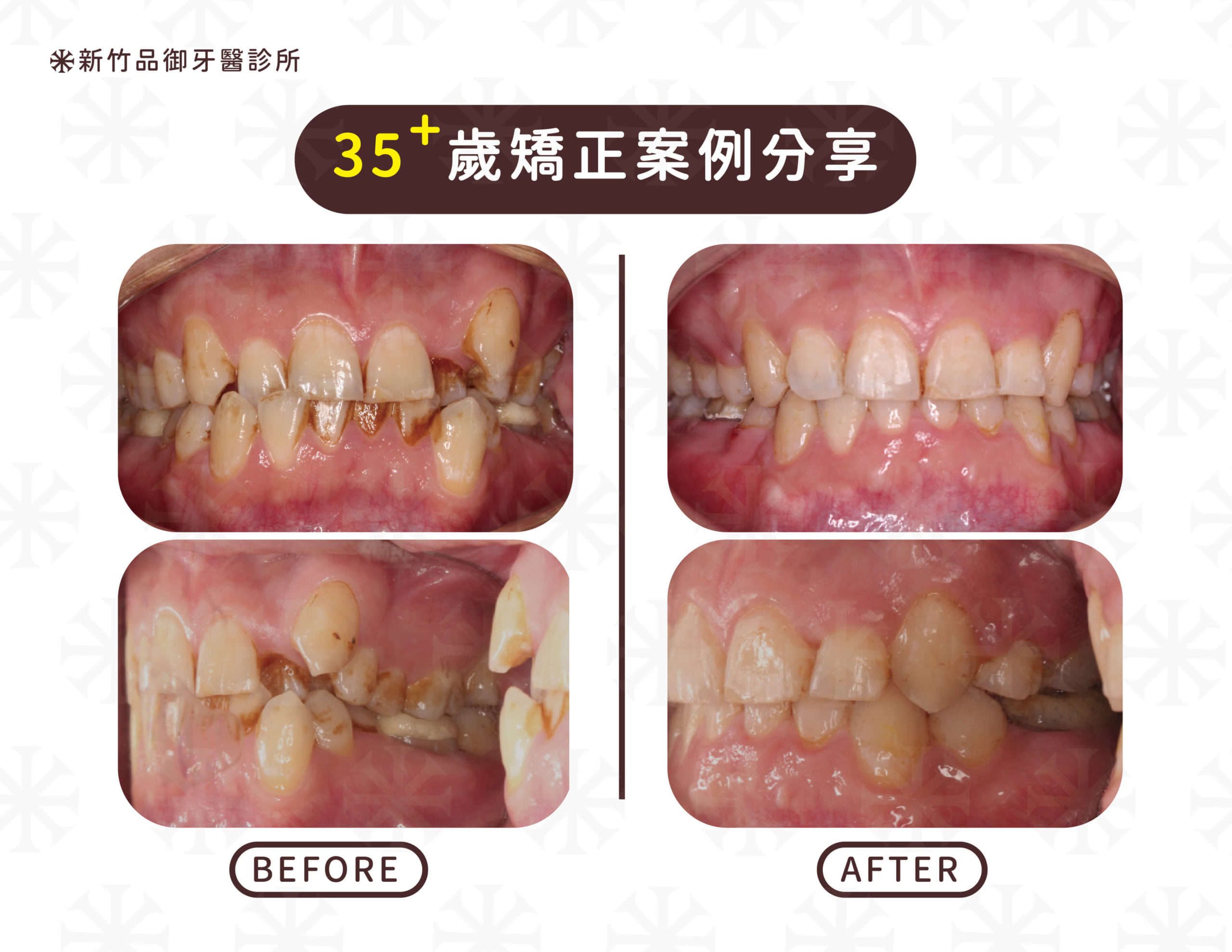 30 歲後到中老年人的矯正考量,除了美觀之外,會優先處理因長期缺牙或排列不正常導致咀嚼功能或牙周狀態喪失的改善。