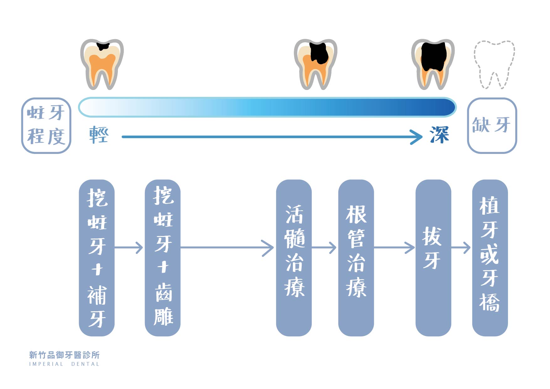蛀牙依嚴重程度和深度分為輕微、中度及深度的蛀牙。