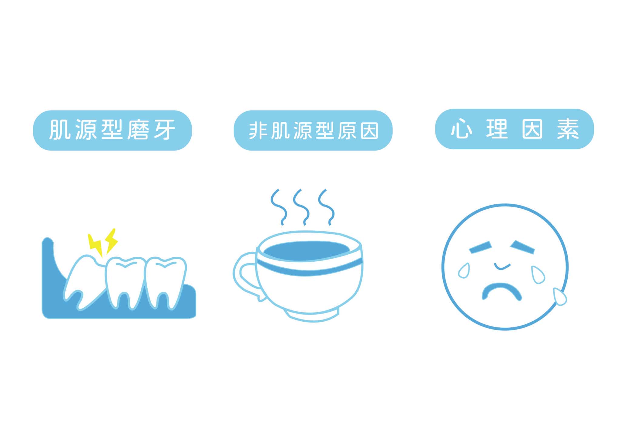 目前醫學對夜間磨牙的因素調查仍不明確,一般認為可能與情緒、壓力或是睡眠障礙……等有關。主要原因分成三大類: