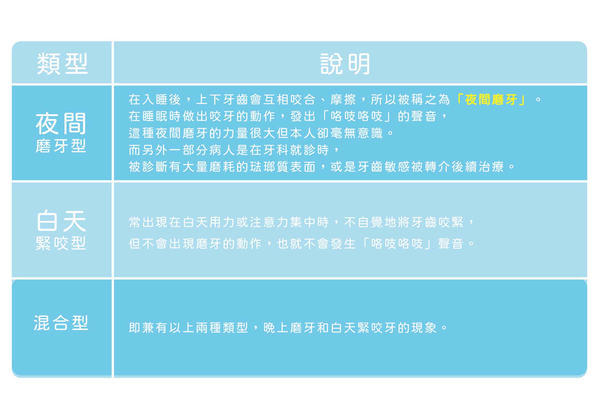我們所謂的「咬牙切齒」,主要分為三種類型:磨牙型、緊咬型、混合型,不同類型所表現的症狀不同。其實磨牙常發生於兒童換牙時期,但是生活中也有部分成人會有這樣的現象,這時候就應該注意這有可能是一種病態表現!