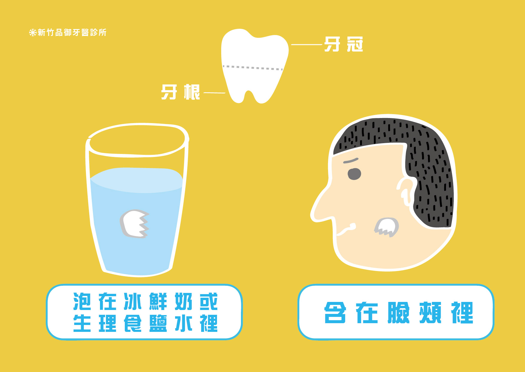 但是如果是整顆牙齒撞掉,就得趕快找到掉落的牙齒,捉住牙冠的部位在用清水沖洗乾淨,接著把牙放在冰牛奶或是生理食鹽水中,或是把牙齒含在臉頰或是牙齦的位置,然後趕快、馬上、立刻來找牙醫。
