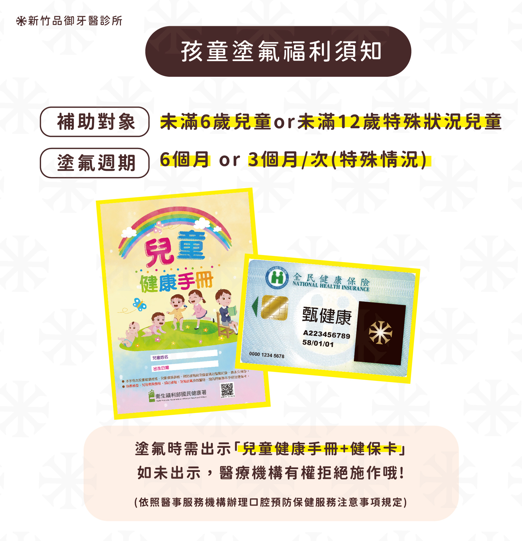 ⚠️ 自112 年 2 月起,家長必須攜帶健保卡及附有「兒童塗氟補助時程與紀錄表」的兒童健康手冊,否則醫療機構可以拒絕補助塗氟。(若無留存兒童健康手冊,可至國民健康署網站下載列印使用)