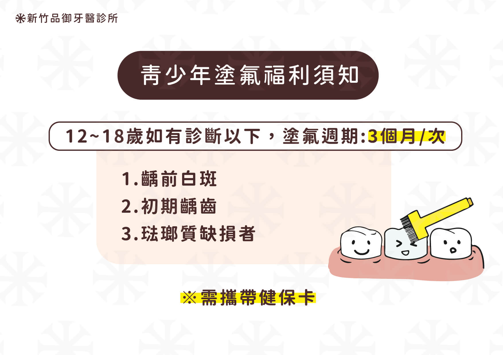 近年青少年常食用高糖、高酸食物,加上口腔清潔不足,容易形成牙菌斑,進而引發蛀牙。為加強維護青少年的口腔健康,健保署規劃了「青少年口腔照護計畫」,由醫師判斷為「齲前白斑、初期齲齒、琺瑯缺損」的青少年,藉由氟化物的幫助,強化牙齒琺瑯質及牙齒的抗酸性、促進牙齒的再礦化。