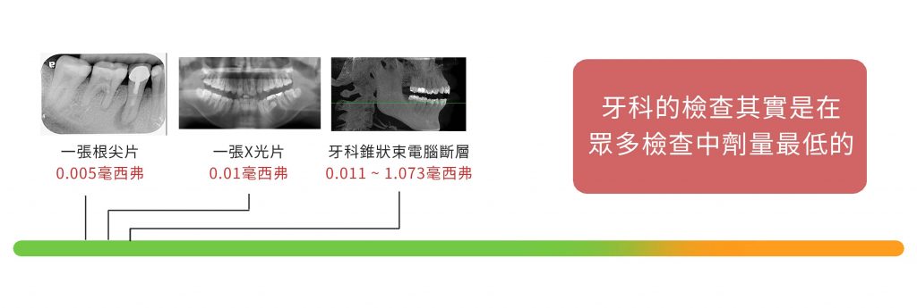 - 牙科錐狀束電腦斷層: 0.011 ~ 1.073 毫西弗(小範圍~大範圍)