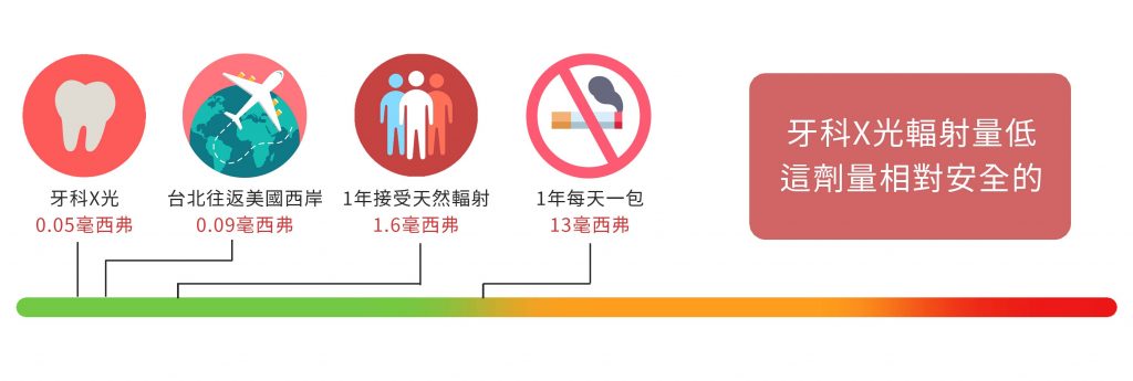 在國際放射防護委員會 ( International commission on Radiological Protection ,簡稱 ICRP )的推薦,一般民眾輻射限值為每人每年不得超過 5 毫西弗,照射一張根尖 X 光是 0.005 毫西弗,換算下來你可能要照個一千張才會超標,所以這劑量相對是安全的。
