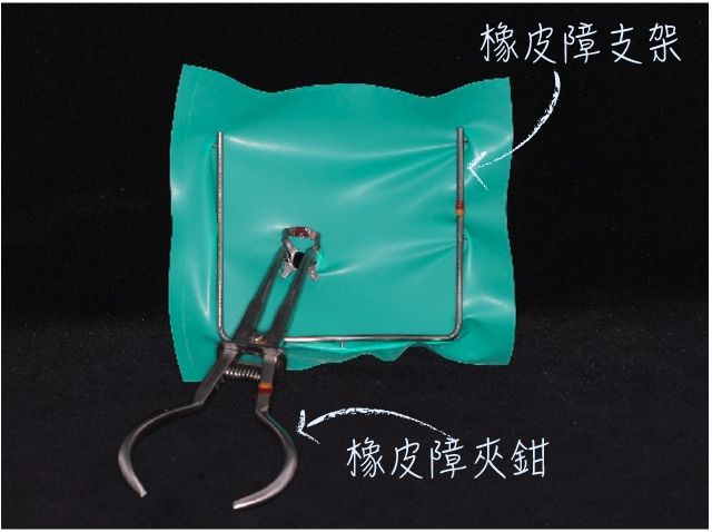 就是牙科治療中,使用金屬套環,像戒指一樣將橡皮布固定在牙齒上,再以支架在口外將橡皮布像帳篷一樣撐開,即完成裝置。
