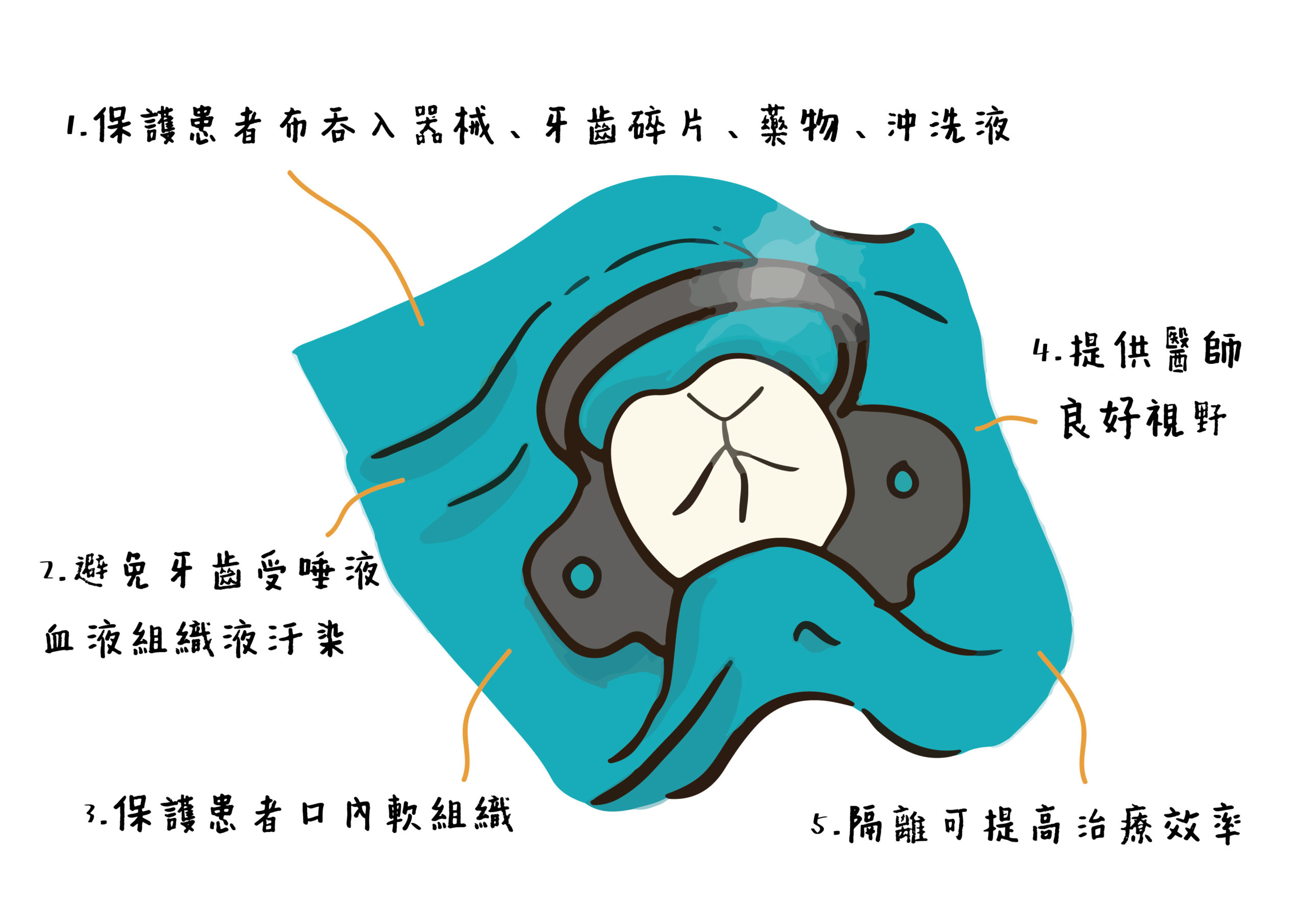 根管治療時使用的沖洗液有些具有刺激性,橡皮障可以將這些液體隔開來,使它們不會流進患者的口腔中,避免刺激病患的黏膜造成傷害。