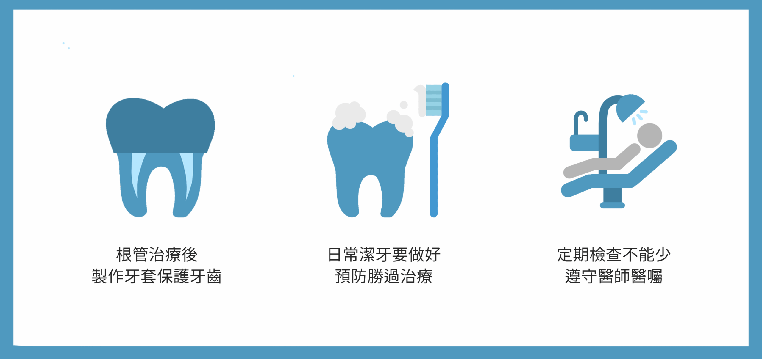 為根管治療後的牙齒選擇最適合的修復方式跟設計。即使牙齒修復好了,後續飲食的選擇、生活習慣的改變、合理牙齒使用、正確的口腔清潔(刷牙、牙線等)、定期回診,這些都是平常應該要負責的工作喔! 這樣牙齒就可以成功被保留下來啦。
