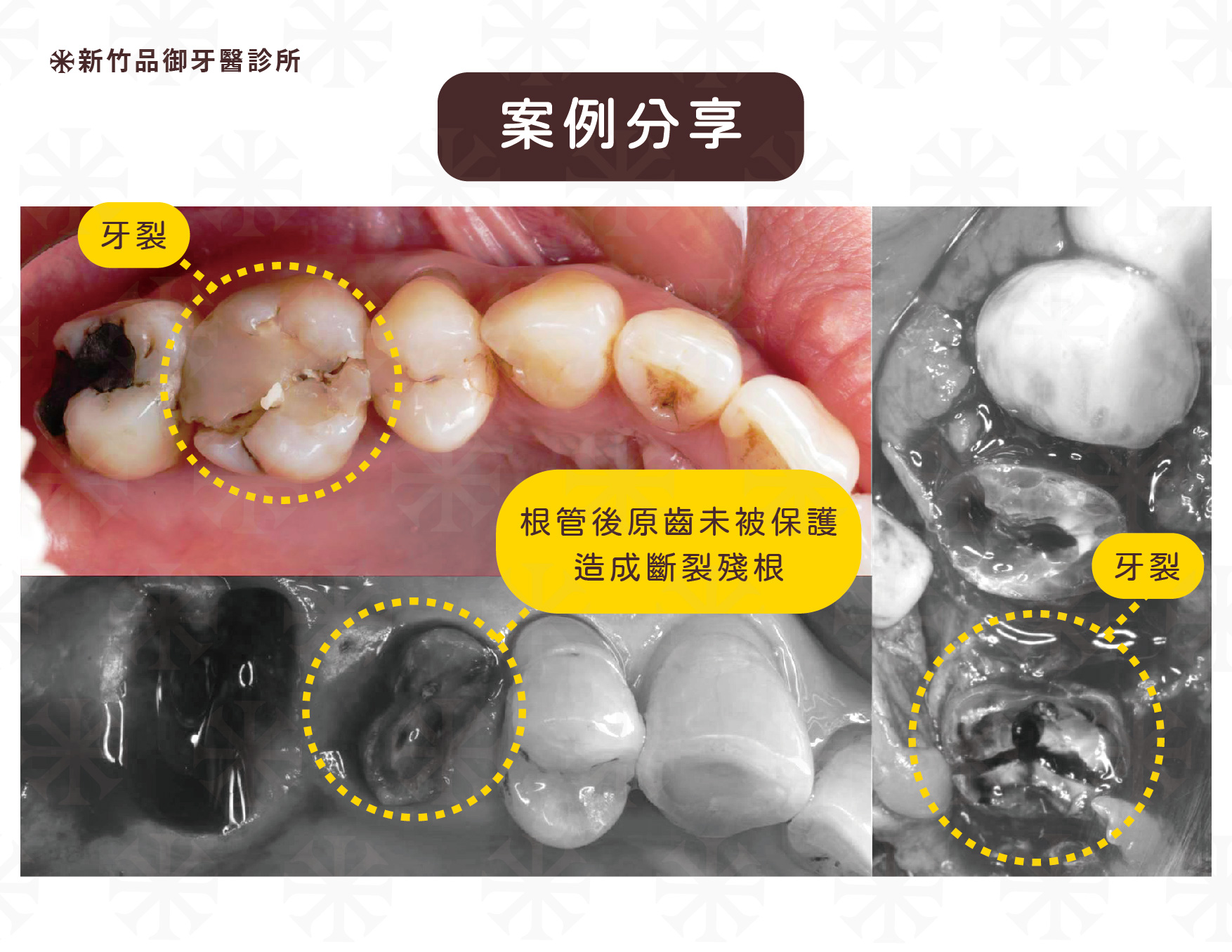 需要根管治療的牙齒通常都是受嚴重蛀牙所擾的牙齒,這種牙齒內部可能已經被掏空,結構相當的脆弱,是絕對不可以咬硬物的。治療結束後如果沒有一個贗復體保護,後續也可能會有牙齒裂開的風險。