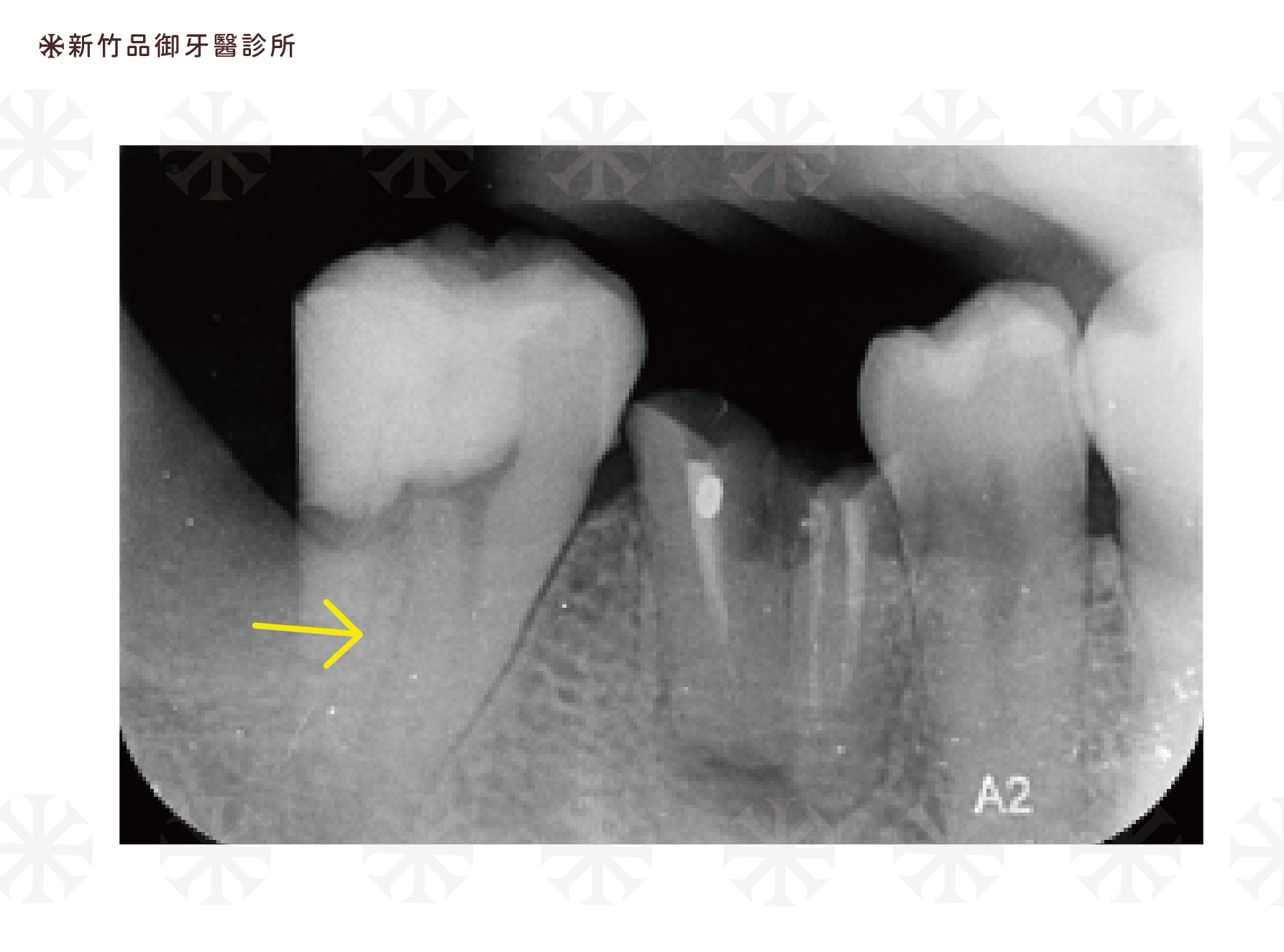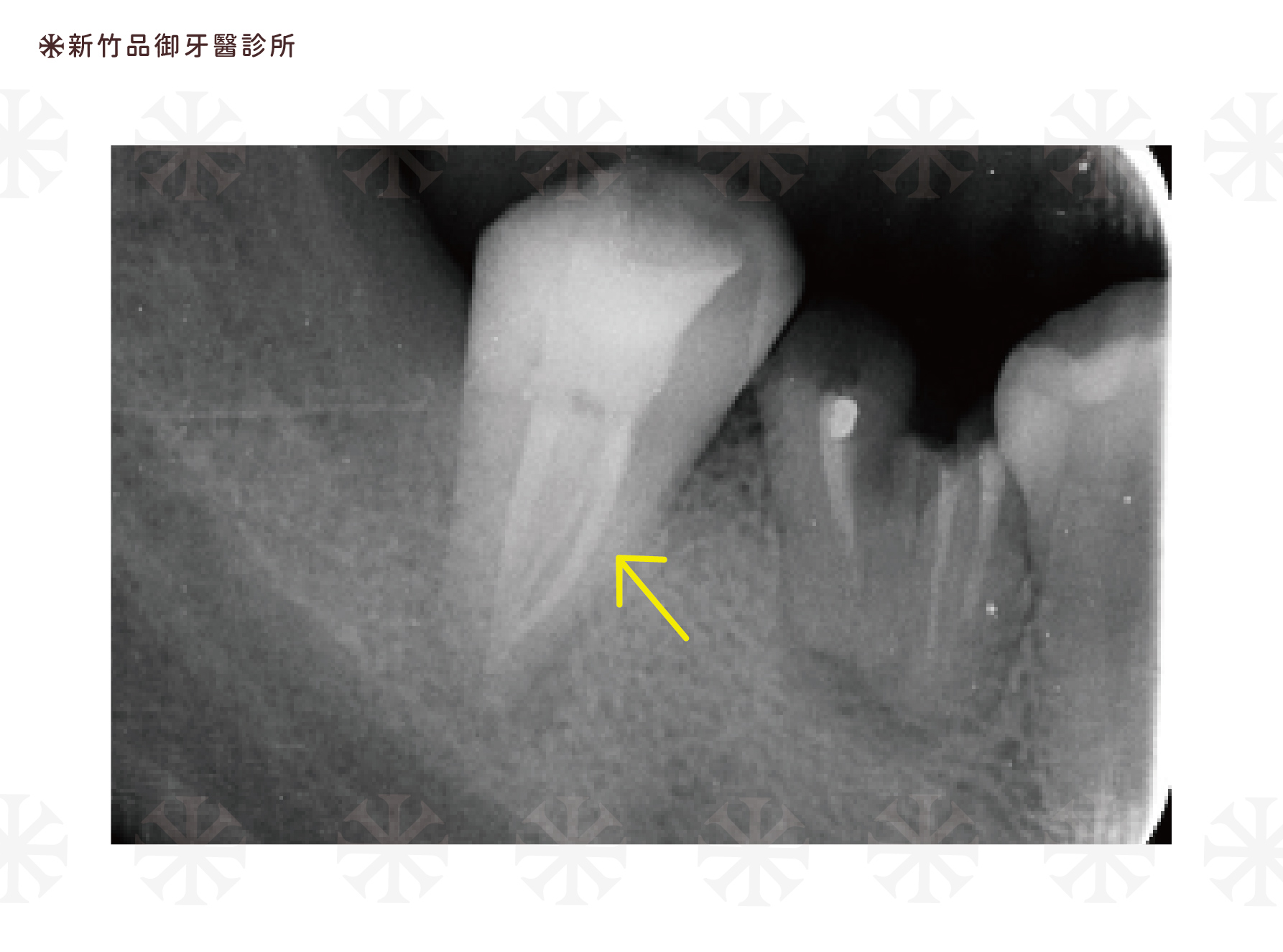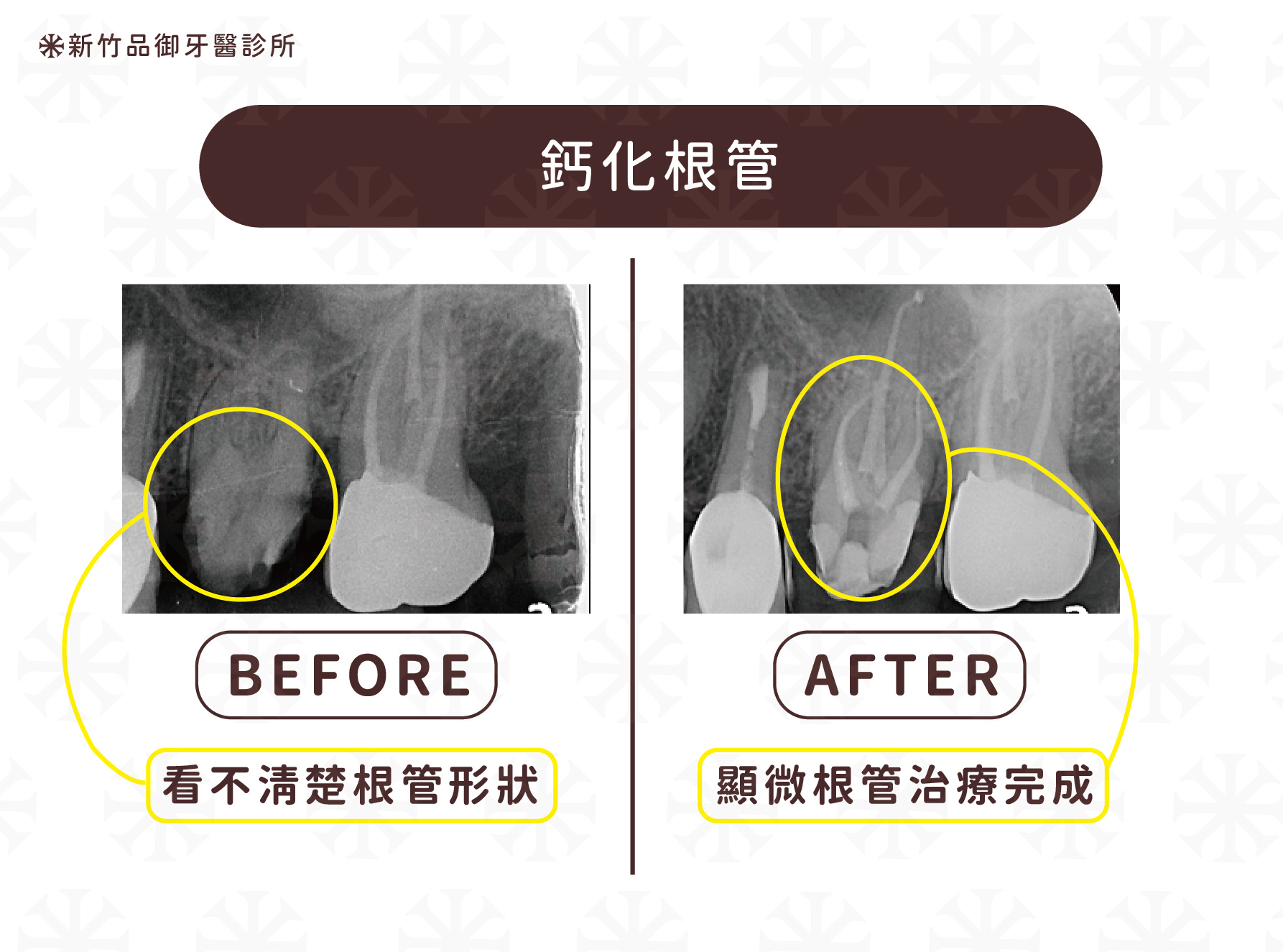 箭頭處所指為鈣化根管。左側初始X光片中,看不清楚根管形狀。但經過顯微根管治療,右側完成X光可看到清潔密封完整的根管。