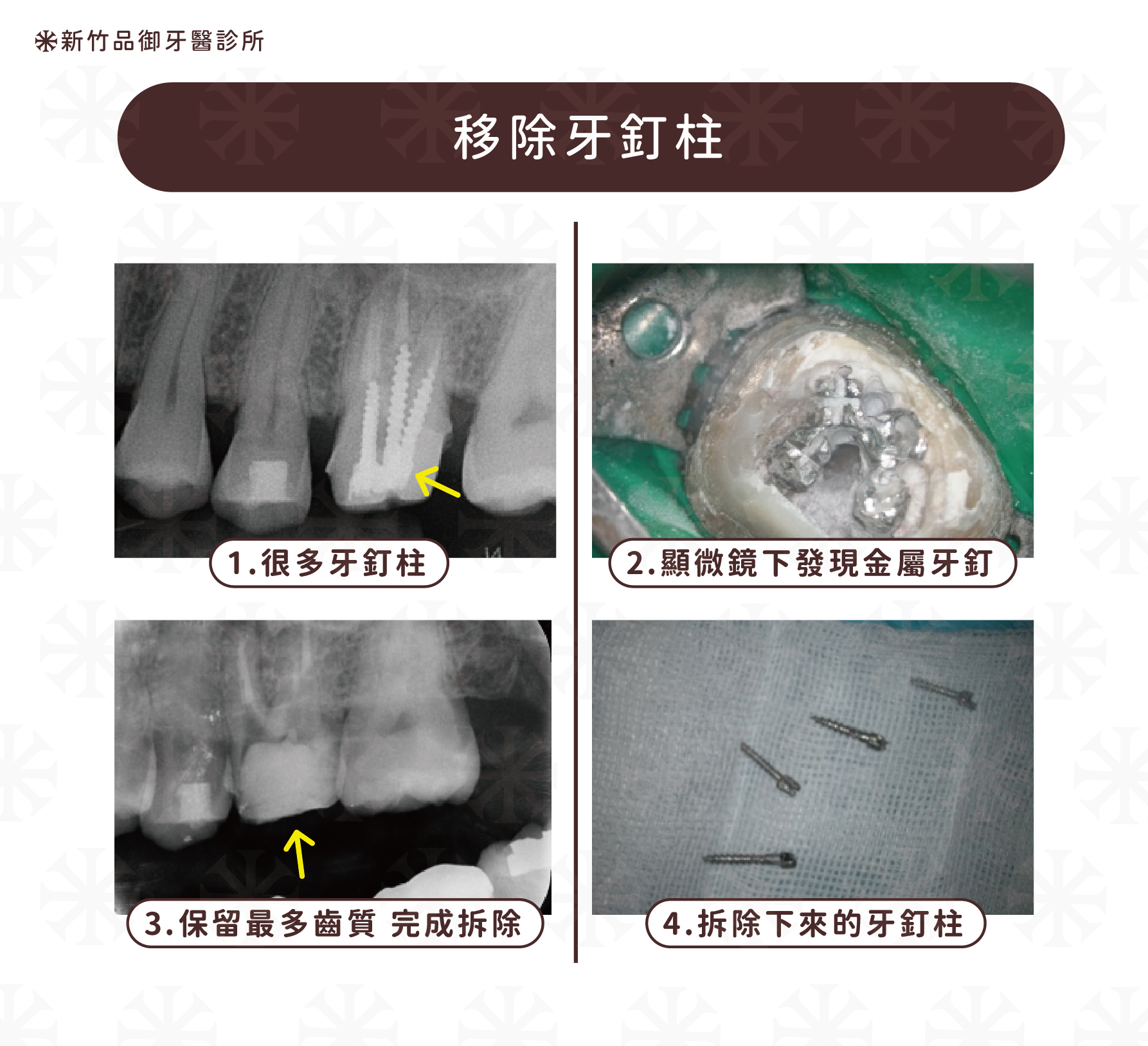 透過顯微鏡,能有效發現和移除金屬牙釘柱,保留齒質,避免過度損傷。