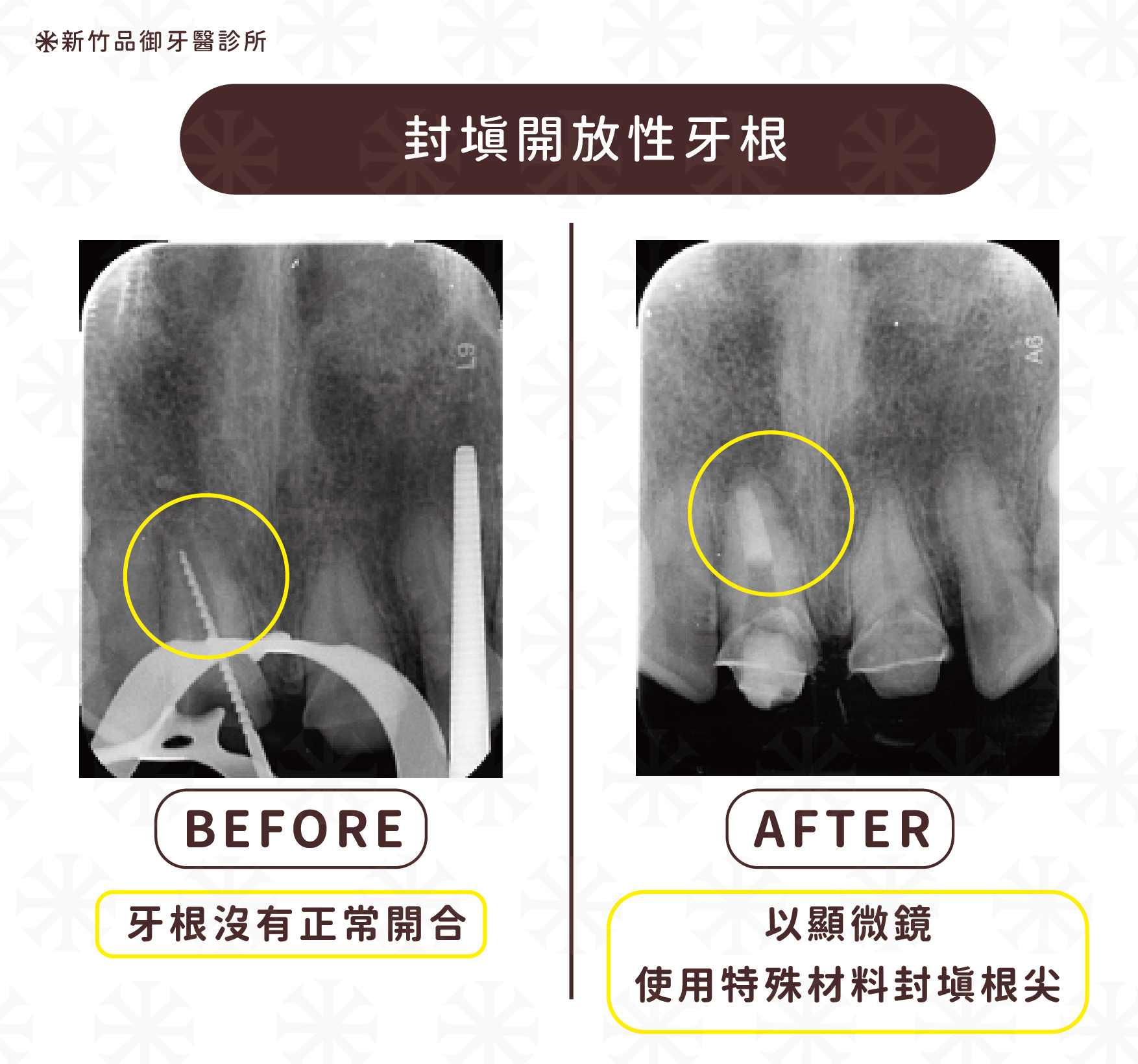 針對開放性牙根,顯微根管治療使用特殊生醫材料封填根尖,有效解決這些問題。